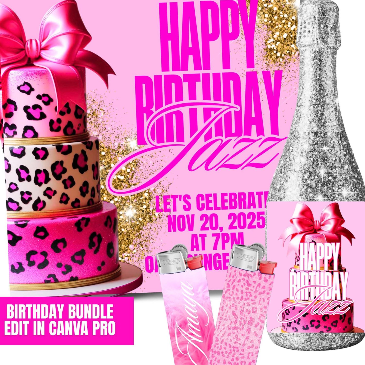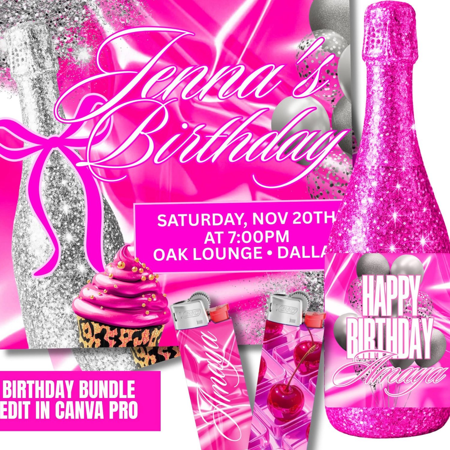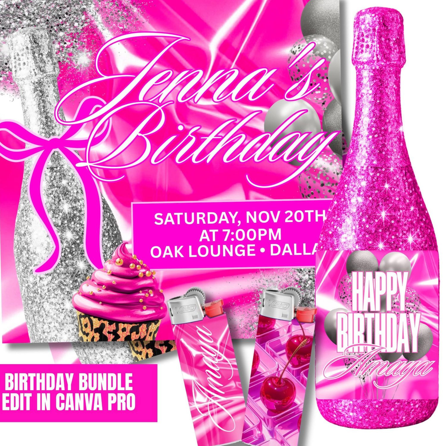 Celebrate in style with our Pink Birthday Bundle! The perfect mix of glam and convenience for party planners, small business owners, and DIY creatives! This all-in-one kit includes 3 social media flyer templates, 3 wine label templates, and 6 pink lighter wrap templates, all fully editable in Canva Pro.