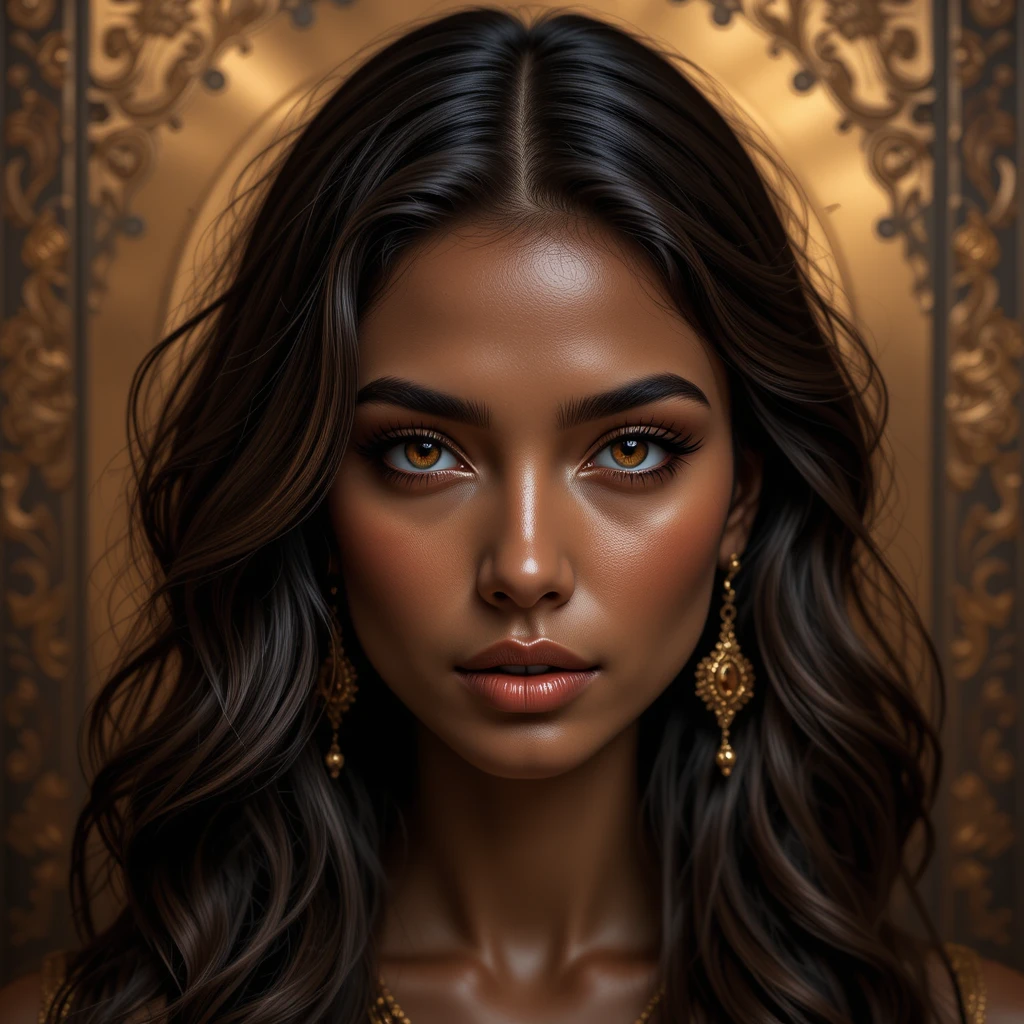 Amber Gaze is a captivating, high-resolution digital artwork created by Æther天神. This portrait showcases a Middle Eastern or South Asian woman with glowing bronze skin, wavy dark hair, and luminous amber-brown eyes. Her gaze is fiery and tender, framed by soft gold lighting and subtle shimmer. The atmosphere is sensual and grounded in rich, cultural warmth.