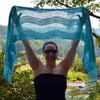 Float down Tranquil River with ease of stitches knit into a light and airy summer shawl. Sun streams through the opaque illusion revealing the inspiration of melting ice cap rivers. Enhance an evening out in Tranquil River with extra color, sparkle, and glam by including optional beads on the fringe.
