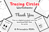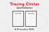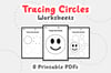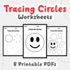 Tracing circles, shapes worksheets for kindergarten, preschool and Montessori kids for handwriting practice and drawing activities in a printable PDF files.