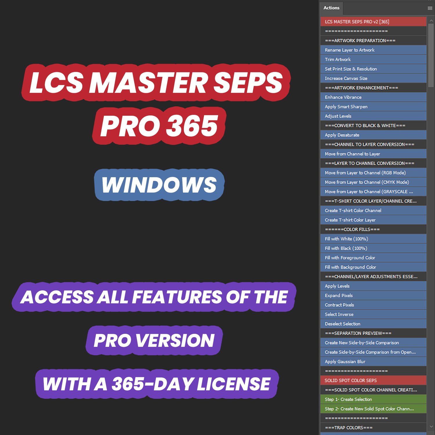 LCS Master Seps Pro Free Trial, Pro 365, and Pro all offer the same advanced Pro color separation actions, with different license durations: