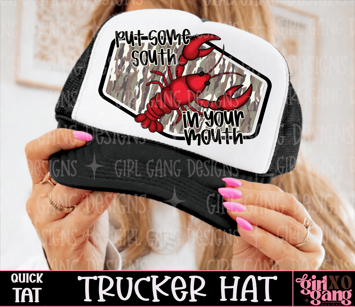Put some south in your mouth Crawfish trucker hat, black trucker hat with mesh back and faux checkered chenille xoxo design
