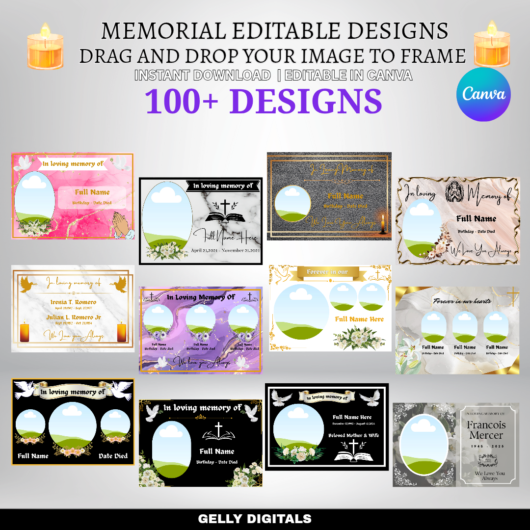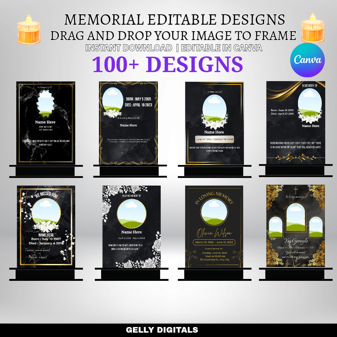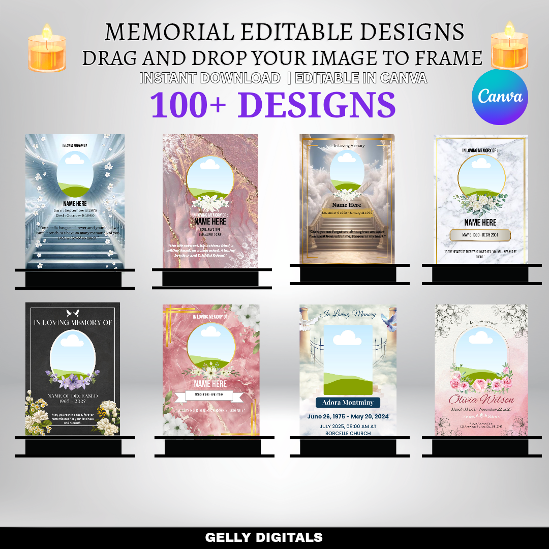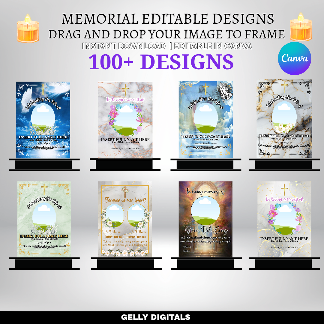 This collection includes 100+ beautifully designed memorial layouts, each fully editable and easy to customize — simply drag and drop your image, change the name, and personalize details in minutes.