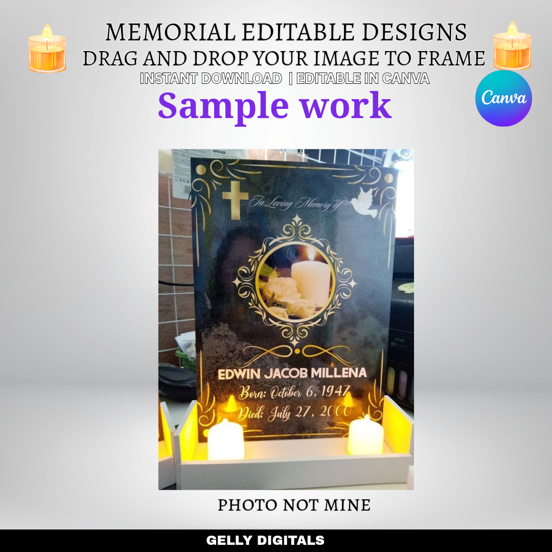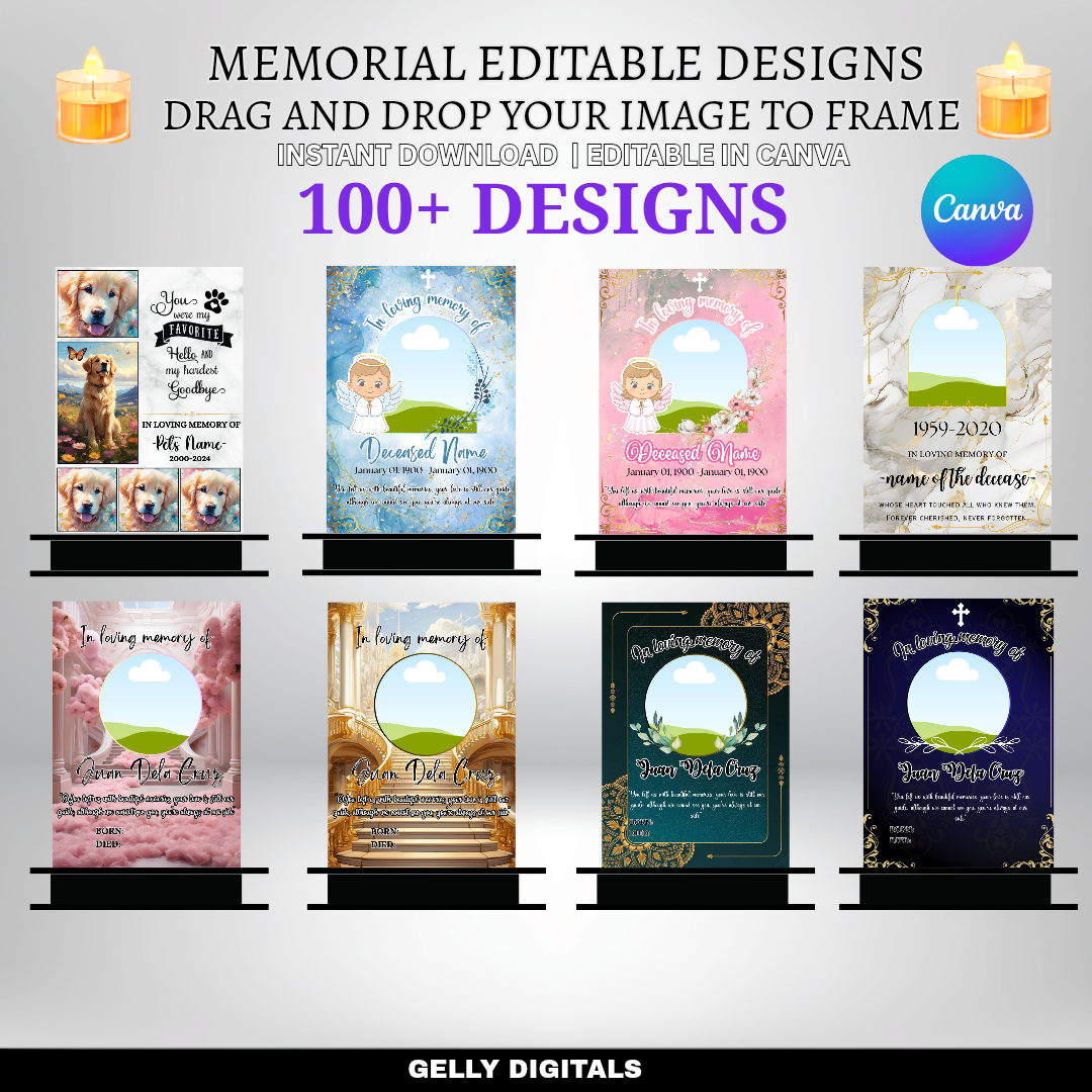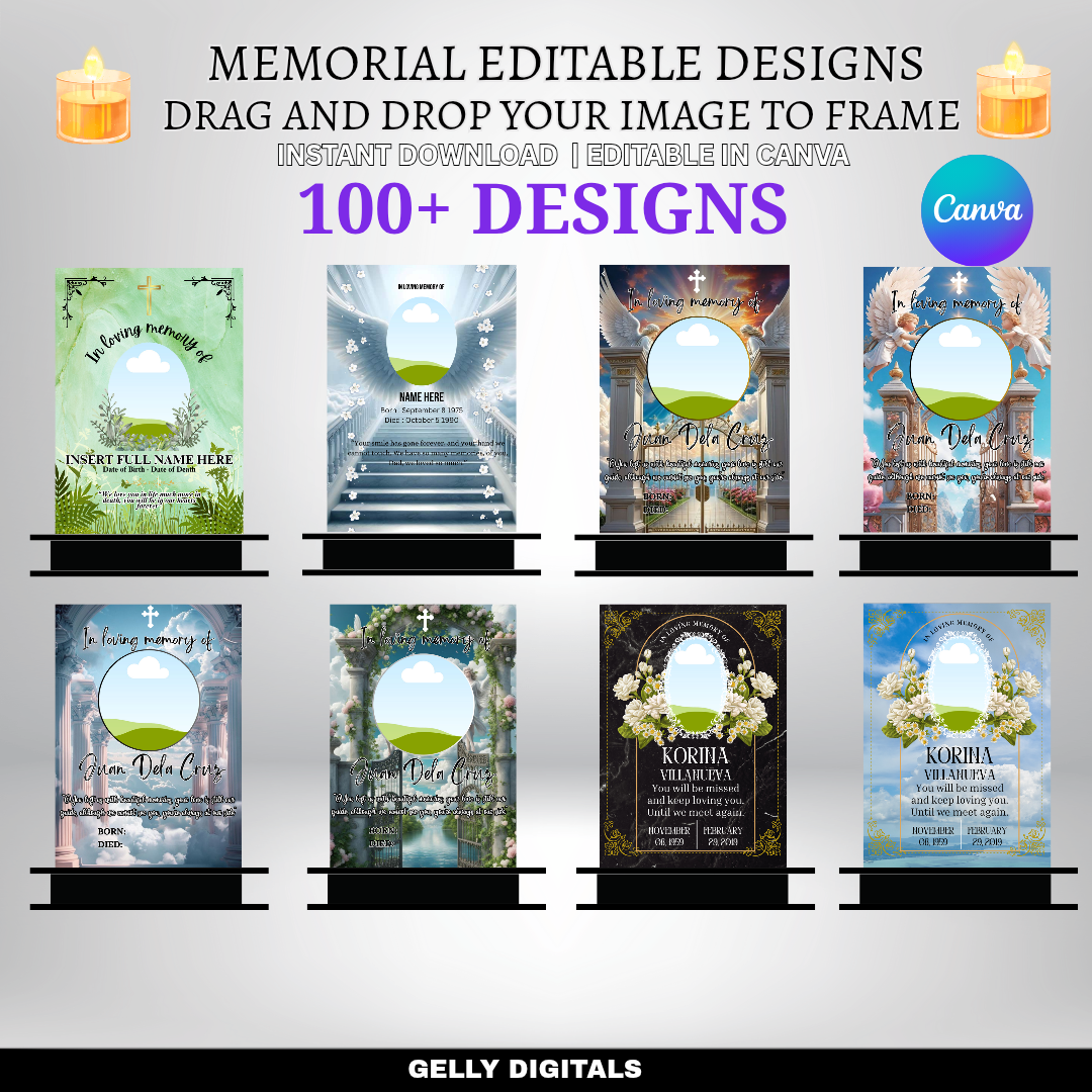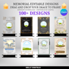This collection includes 100+ beautifully designed memorial layouts, each fully editable and easy to customize — simply drag and drop your image, change the name, and personalize details in minutes.