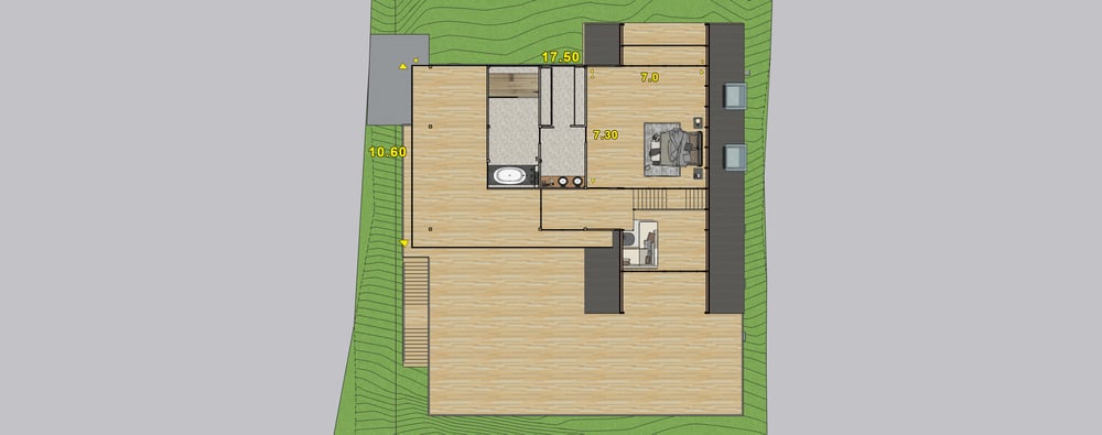 PLANOS CABAÑA DE LUJO 17×18 m Espectacular modelo con 3 habitaciones y terraza amplia