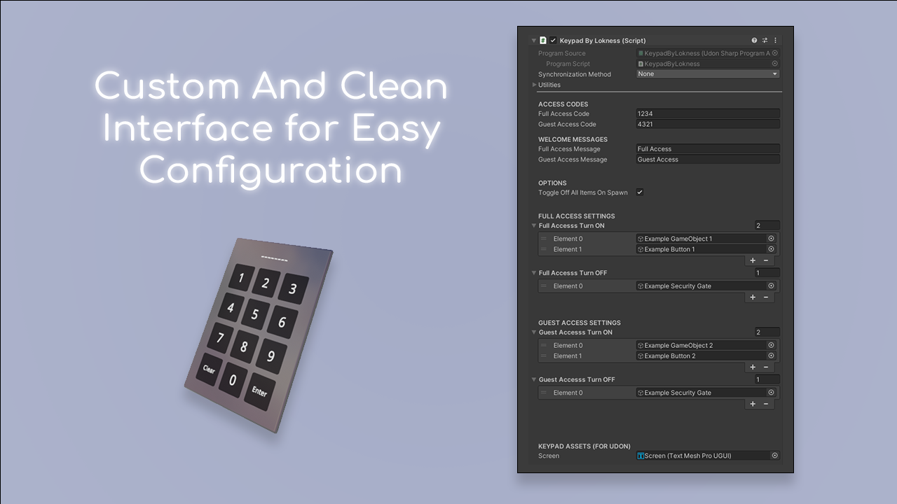 - Udon Sharp code with comments so you can easily customize this keypad if necessary.