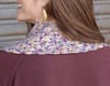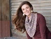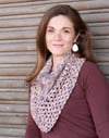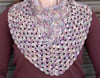 This small bandana cowl uses two different stitches to play with the colors in a variegated skein of fingering weight yarn. The linen stitch at the top is worked back and forth and blends colors together, while the rows of shell stitches at the bottom cluster sections of color.