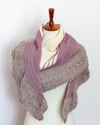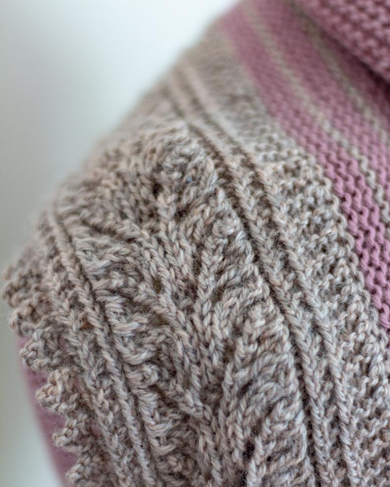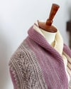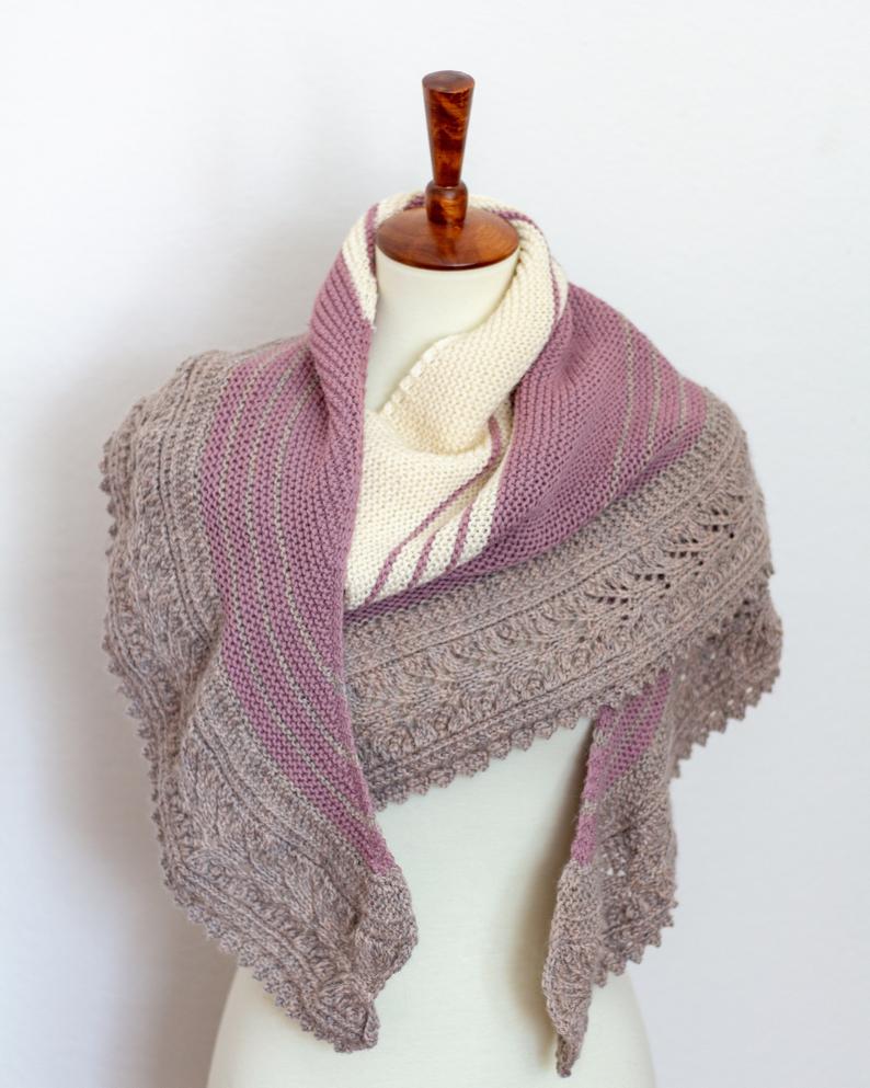 This shawl is a semi-circular shawl in three colors. It is worked up mostly in a soothing garter stitch with a simple, 8-repeat, knit-on lace border. It is a great fit for adventurous beginners or for more experienced knitters who want a project they don’t have to look at too much.