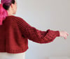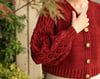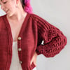 Alder Cardigan is knit seamless from the top down with raglan shaping. The button band is worked at the same time with the seed stitch body. Shoulders are completed in the seeded rib which flows into the patterned balloon sleeves. The sleeves feature traveling stitches and only require various increases and decreases for the stitch pattern.