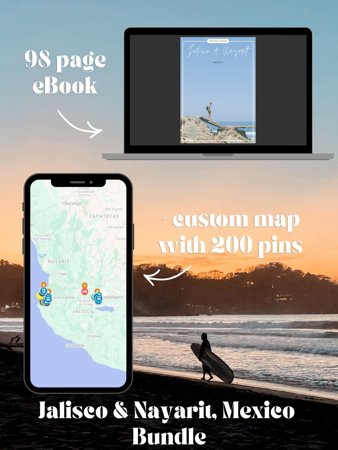 Plan the perfect adventure in Jalisco & Nayarit with our bundle, including our 98-page travel guide eBook plus our custom map with over 200 pins.