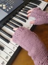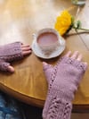 I’m sure I will think of something to say about these DK weight fingerless mitts that are worked up in a lovely merino/silk blend from the wrist cuff to the finger cuff with a thumb gusset and lacy ribbed accents…eventually.