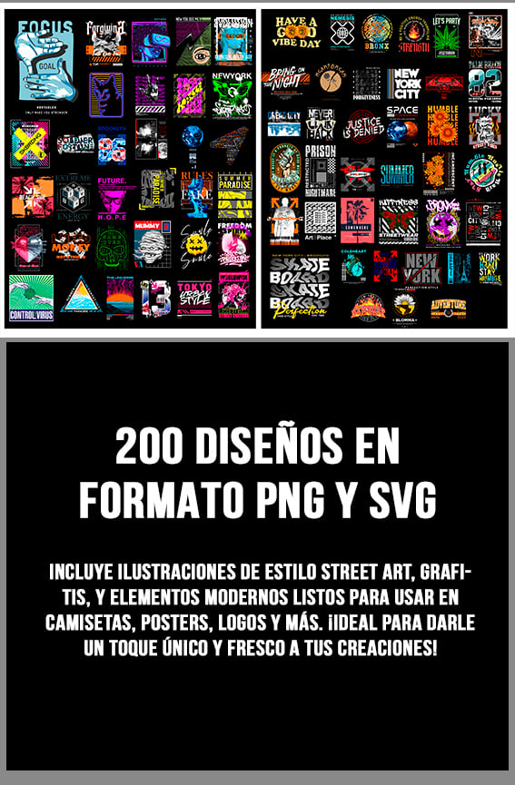 ¡Desata tu creatividad con nuestro Pack de 200 Diseños Urbanos! Una colección única de ilustraciones street art, grafitis y gráficos modernos en formatos PNG y SVG, ideales para darle un toque fresco, atrevido y original a tus camisetas, logos, posters y más. Con estos diseños, podrás añadir una vibrante energía urbana a cualquier proyecto. ¡Haz que tus creaciones sean imposibles de ignorar!