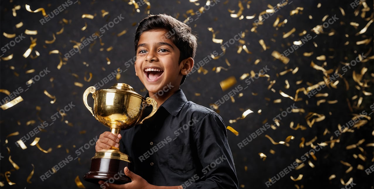 Young Indian Boy Holding Gold Trophy with Confetti Background. Student Award and Recognition Concept.