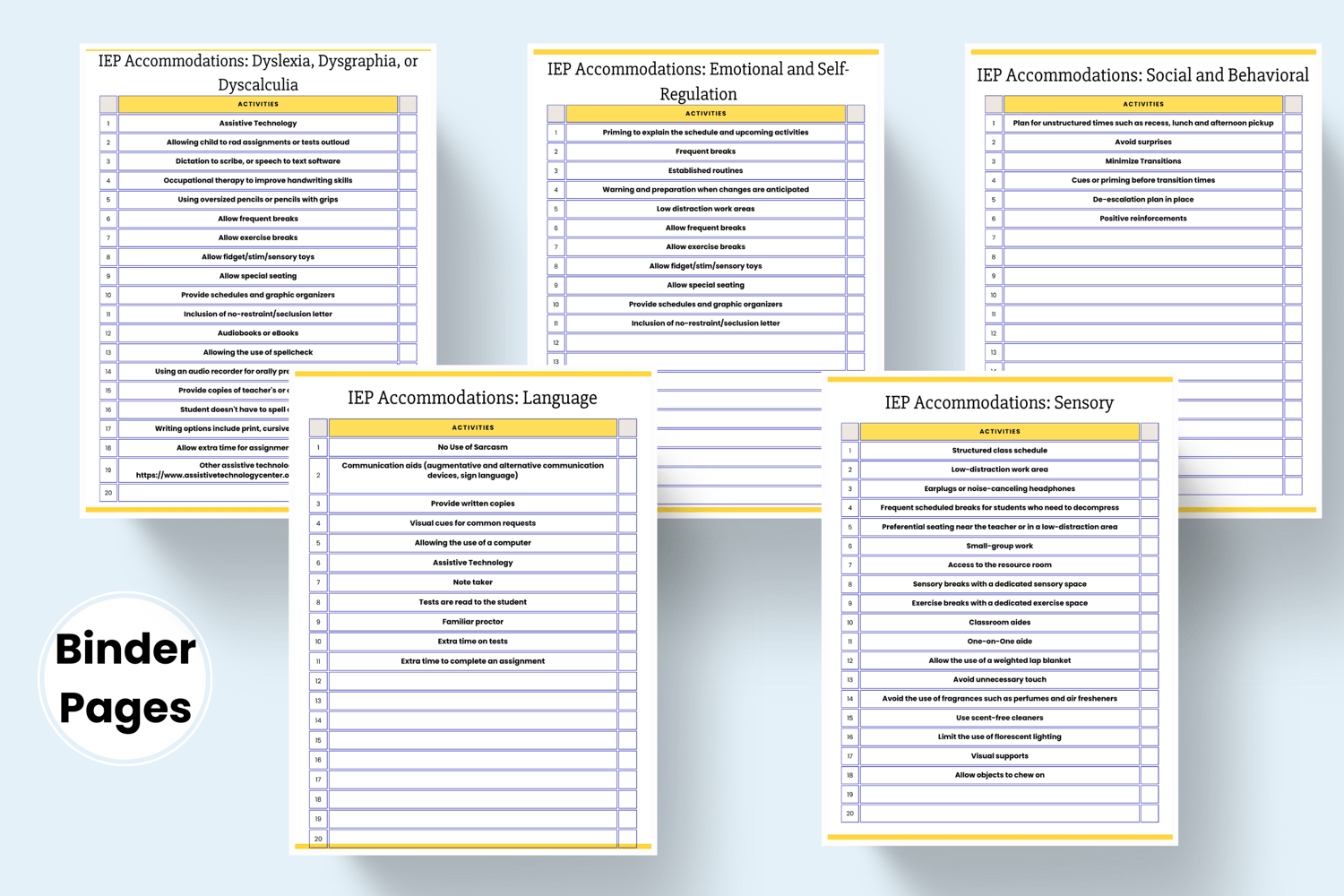 - Tailored Accommodations Lists: Includes the accommodations you can request for the support areas of sensory, language, social and behavioral, emotional and self-regulation, and specific learning disabilities like Dyslexia, Dysgraphia, and Dyscalculia.