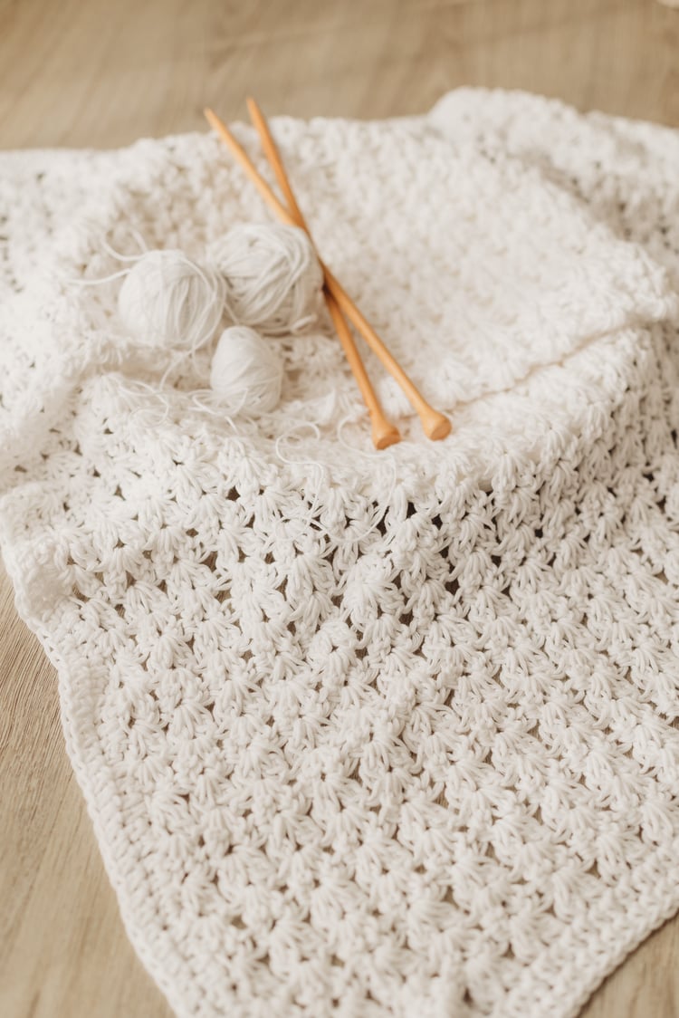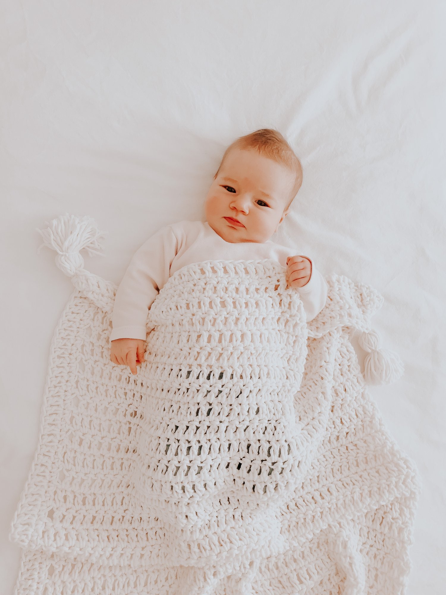 Perfect first blanket project for absolute beginners. This rustic design with a vintage feel is easy and fast to make. Timeless family heirloom, beautiful in its essential simplicity. It will add an earthy touch to any baby nursery or newborn photo shoot. Decorated in the corners with fluffy tassels for a cozy feel.