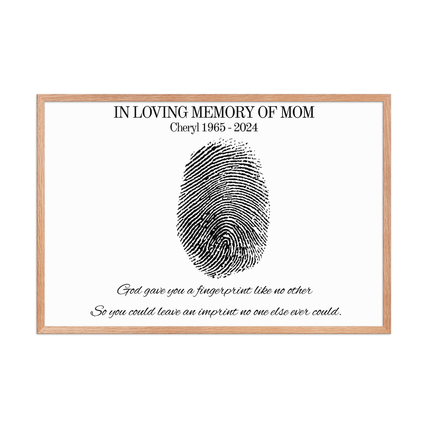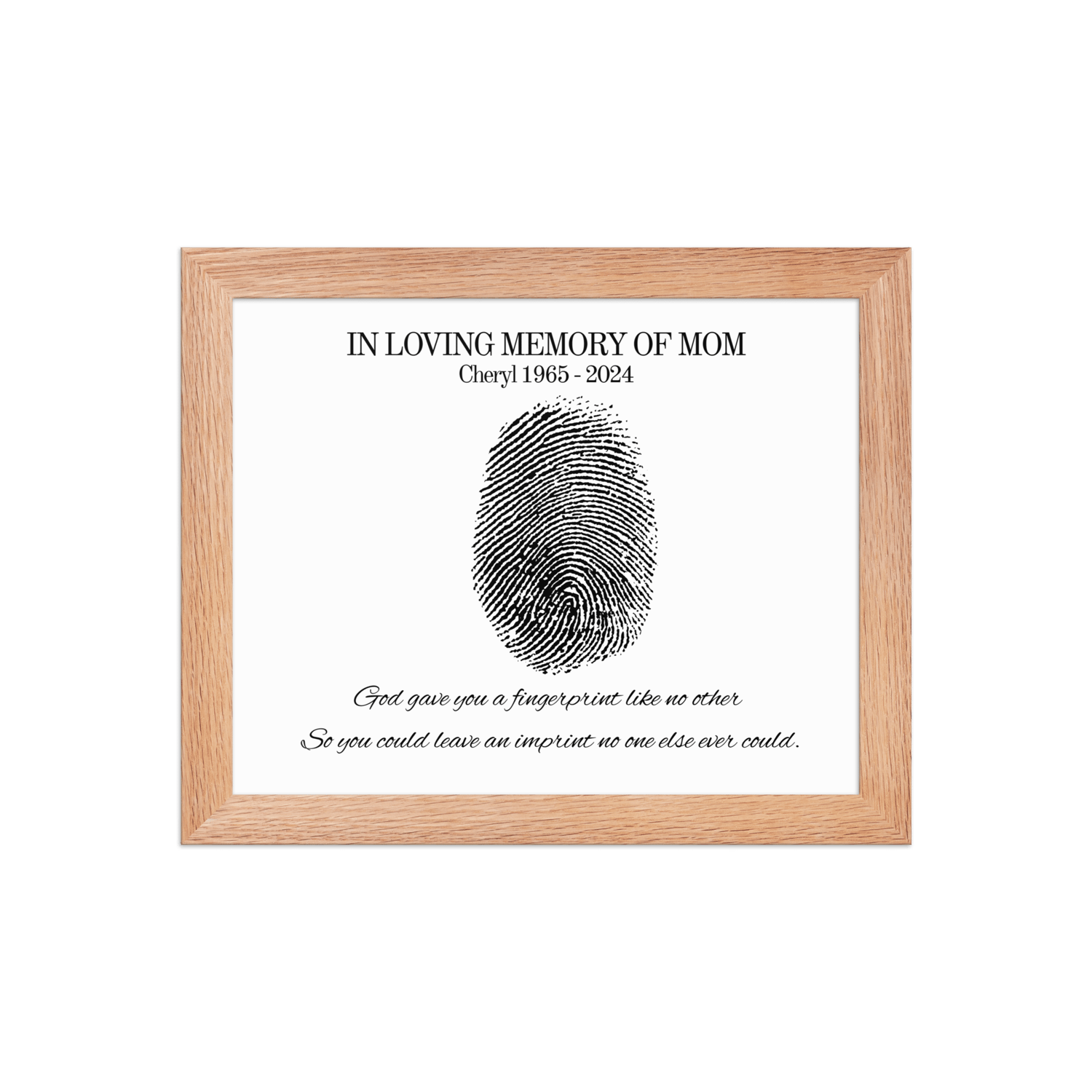 Designed to bring comfort during grief, this custom design features your loved one’s name and dates beneath a fingerprint illustration — a powerful symbol of their unique impact on your life.