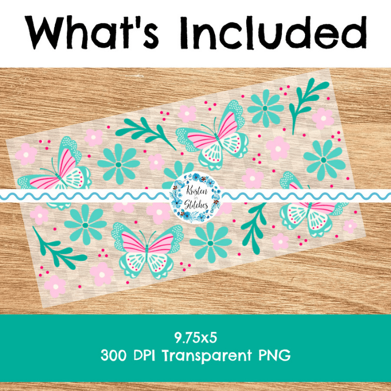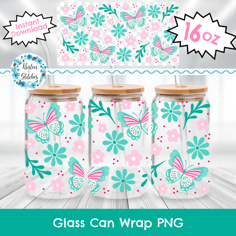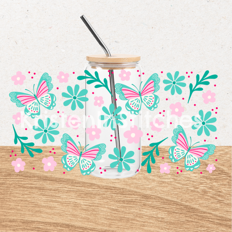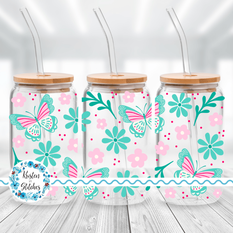 Butterfly Garden Glass Can Wrap Transparent Cup PNG, Pink and Mint Butterflies