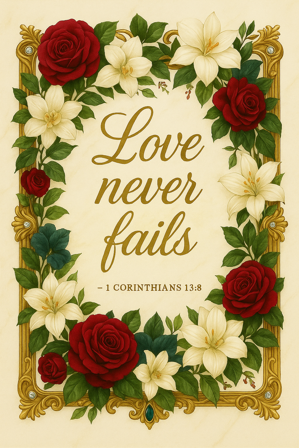Let love bloom eternally with this Christian Love Never Fails Wall Art featuring 1 Corinthians 13:8, illustrated with a graceful floral border of red roses, white lilies, and golden accents. This printable is ideal for faith-based wedding gifts, anniversary bundles, and devotional wall decor, offering a visual and spiritual reminder that true love — rooted in God — never fails.