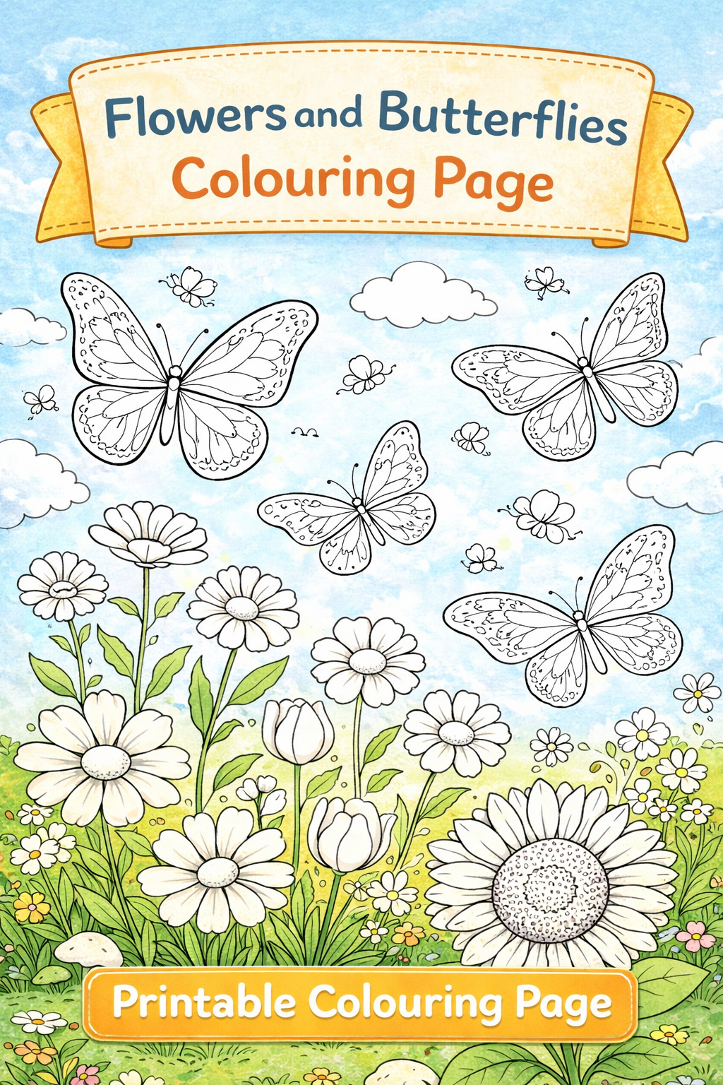 A beautiful and relaxing colouring page for kids featuring butterflies flying over a garden full of flowers. Perfect for spring activities, classroom use, homeschooling, or fun creative time at home.