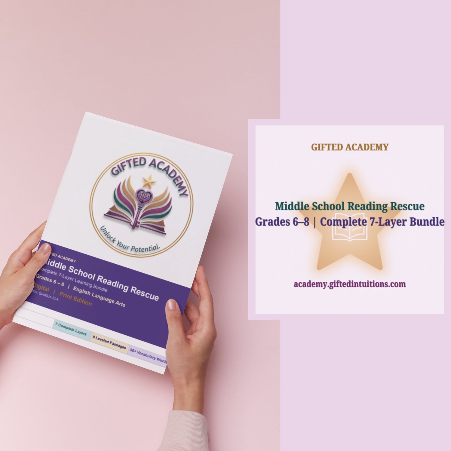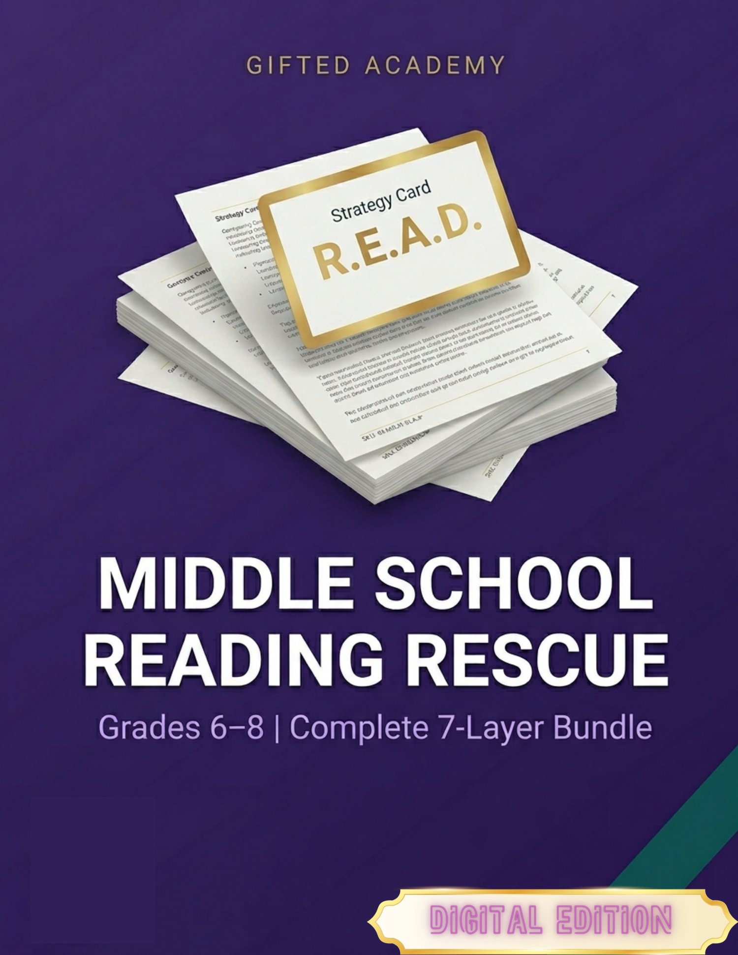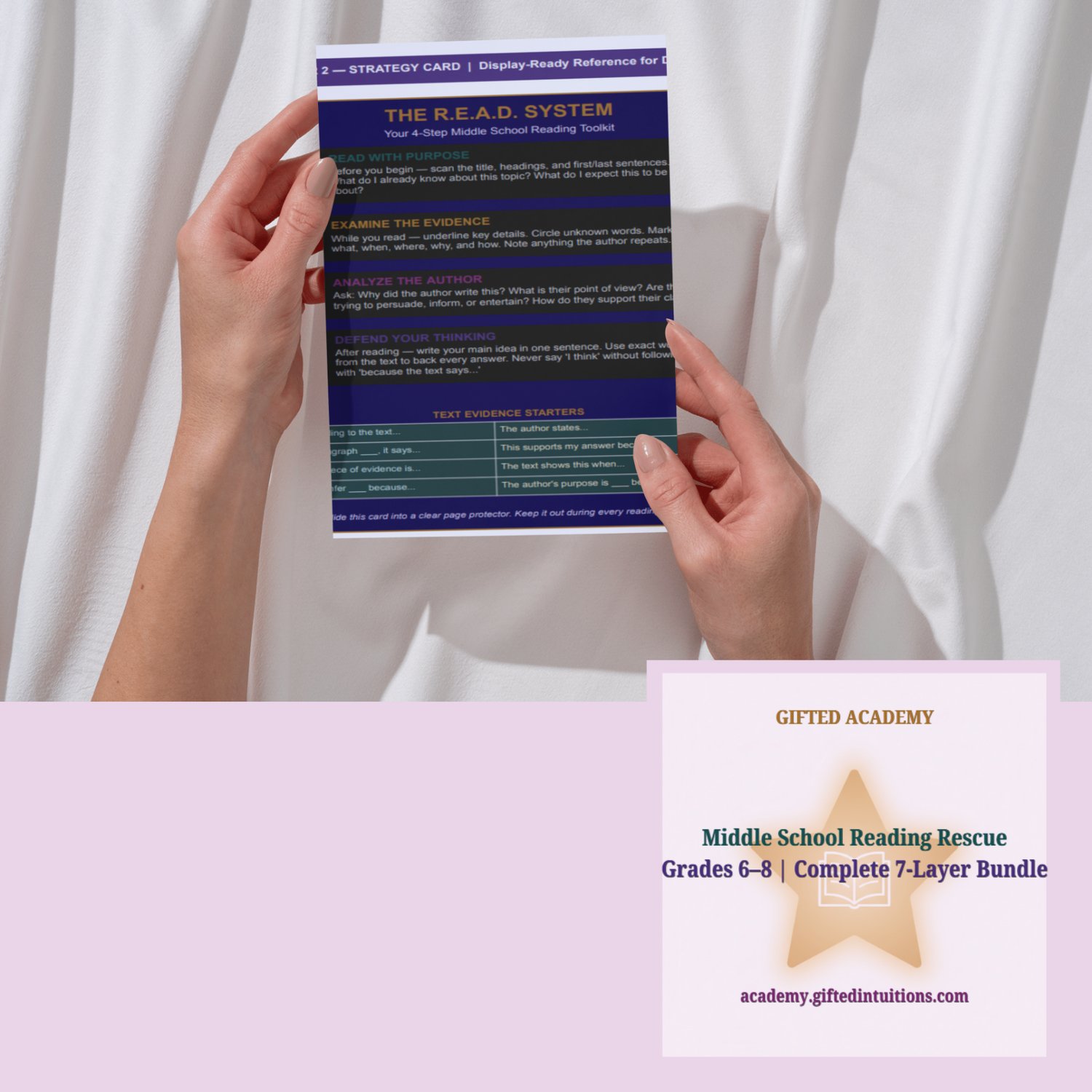Middle School Reading Rescue is a complete, self-contained learning bundle that teaches your 6th, 7th, or 8th grader the five core reading skills that power every passage, test, and essay they will face in middle school — and beyond. Everything they need is inside one printable document. No accounts, no subscriptions, no logins.