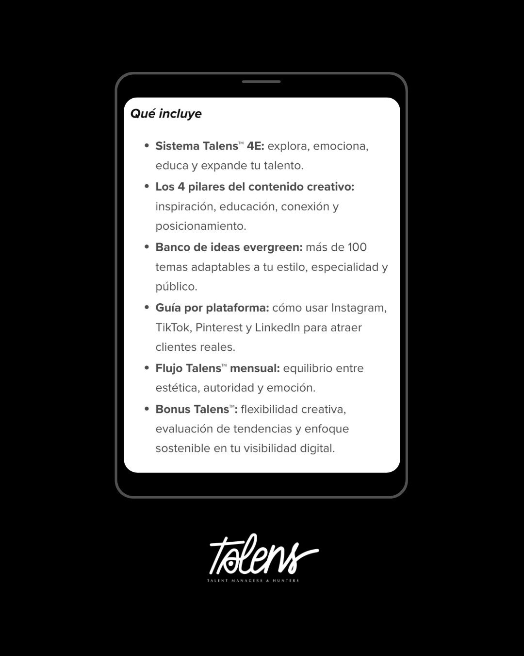 Este Playbook Talens™ te enseña a comunicar la belleza que creas con estrategia, coherencia y propósito.Está hecho para diseñadoras que quieren dejar de depender del “boca a boca” y construir una marca visual sólida, rentable y reconocida.
