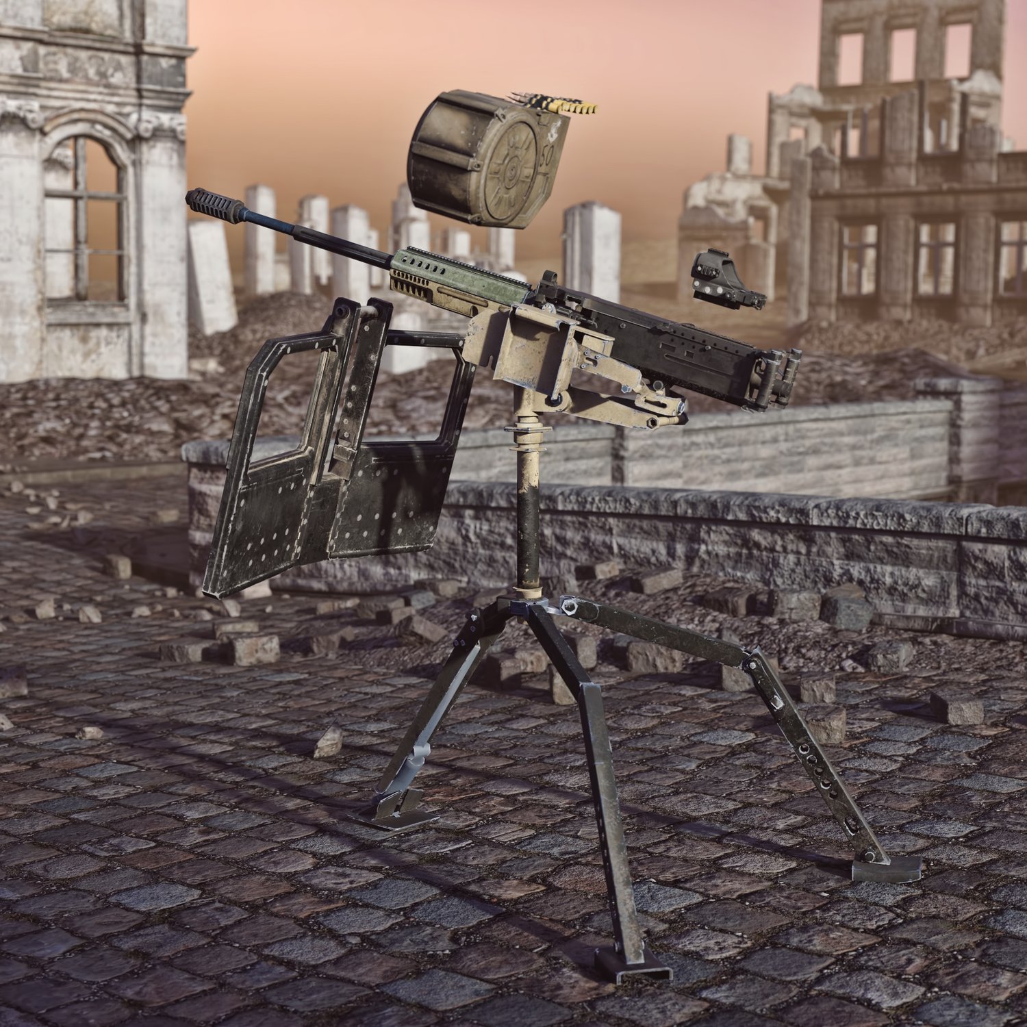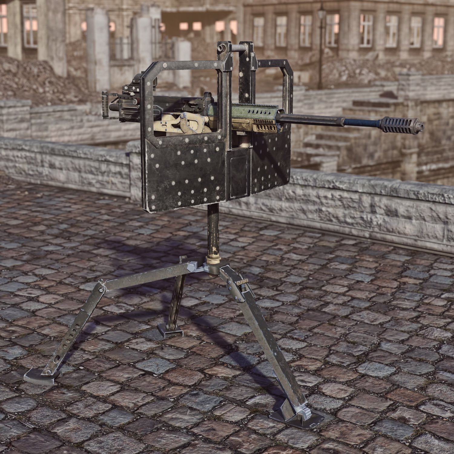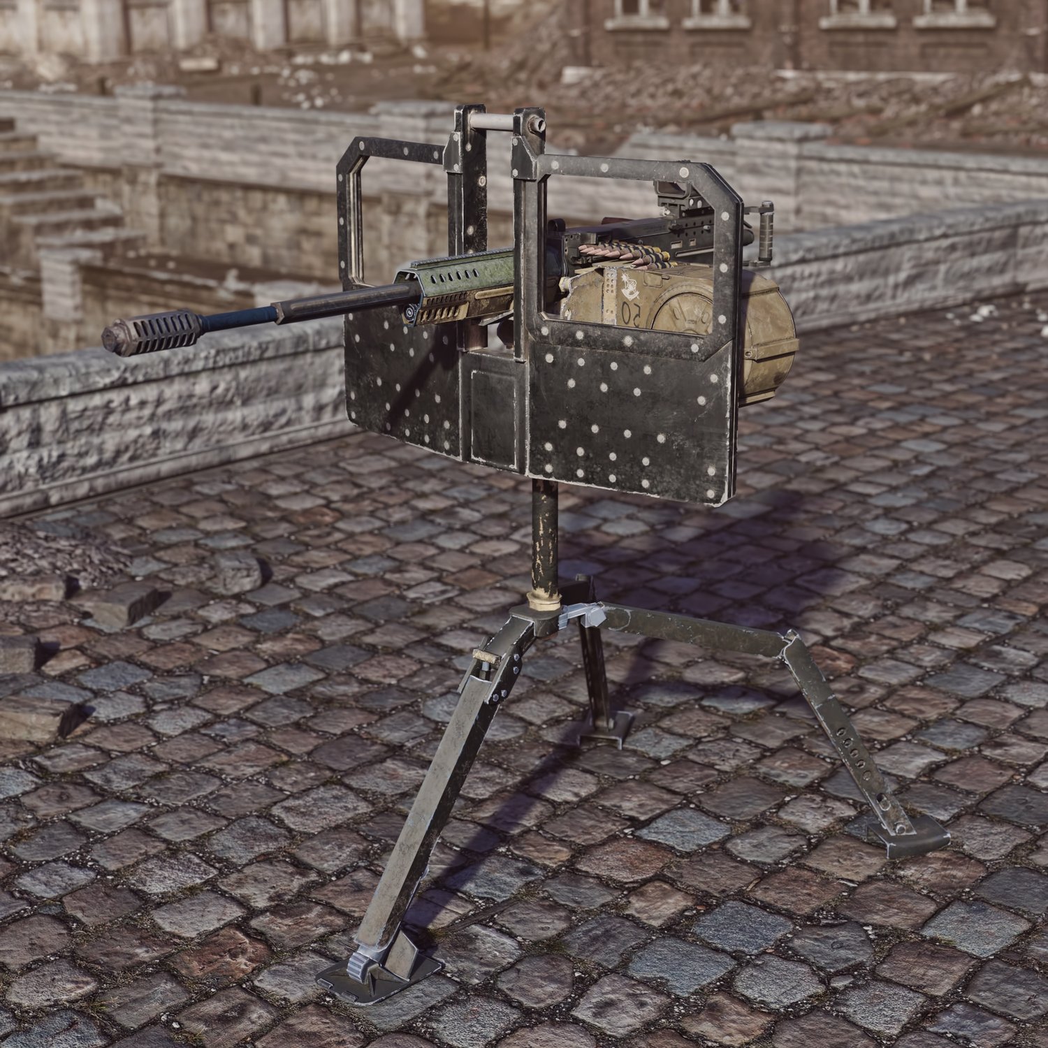 A heavy machine gun mounted on metallic tripod. The prop is rigged and converted for use with DAZ. The legs, rotating part, pivoting part also rigged for more realistic pictures. The legs are pretty flexible so the sentry gun can be mounted in tight places.