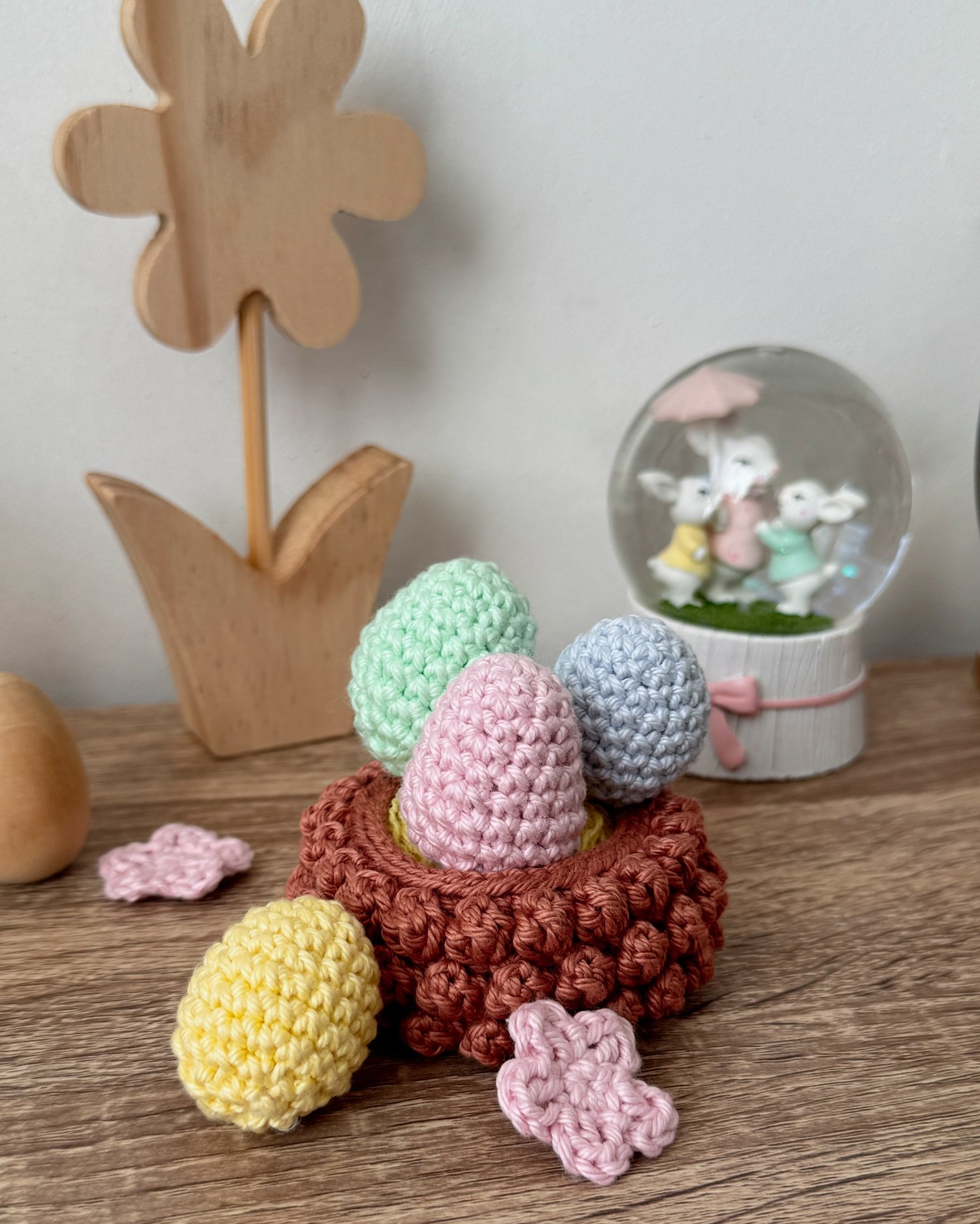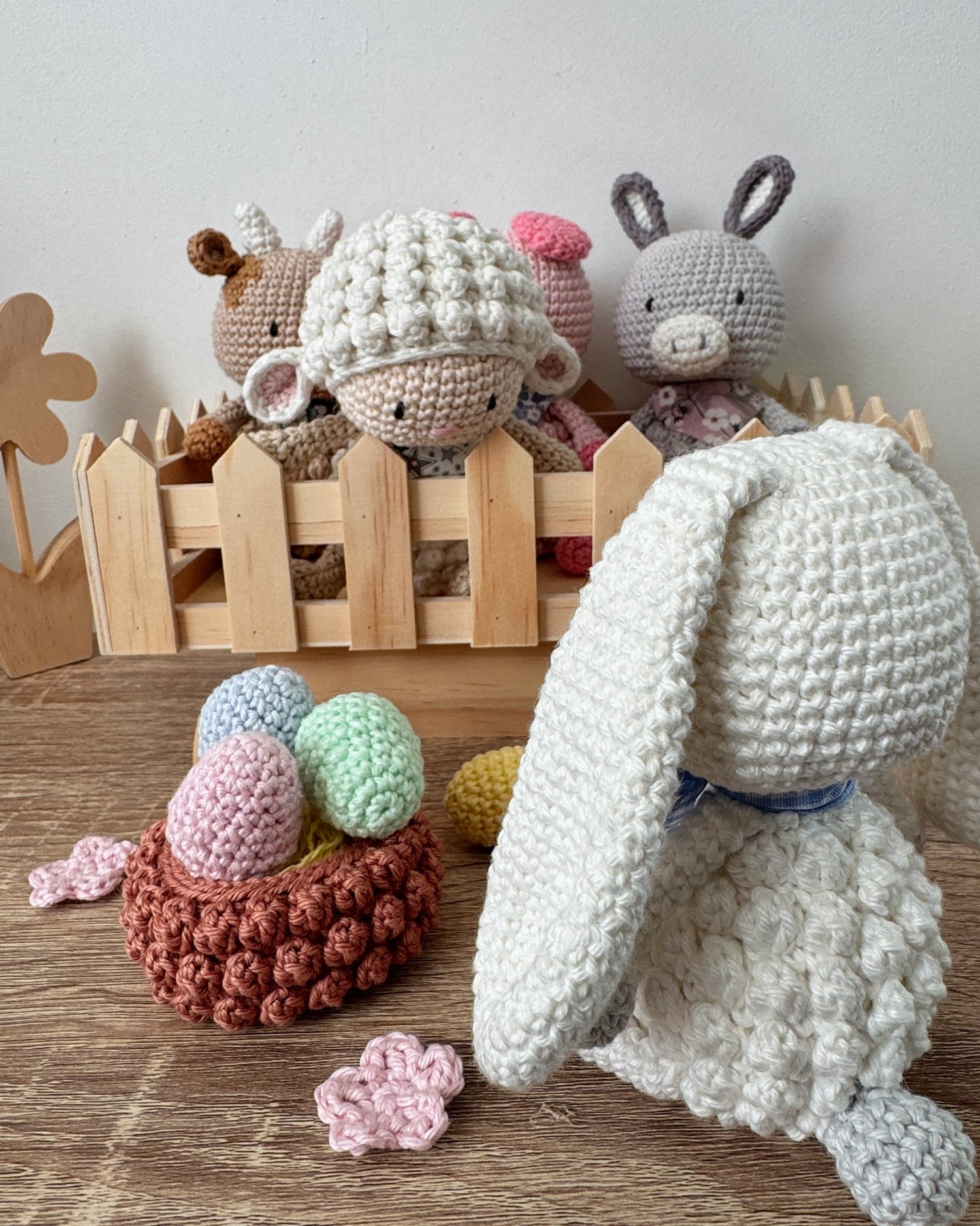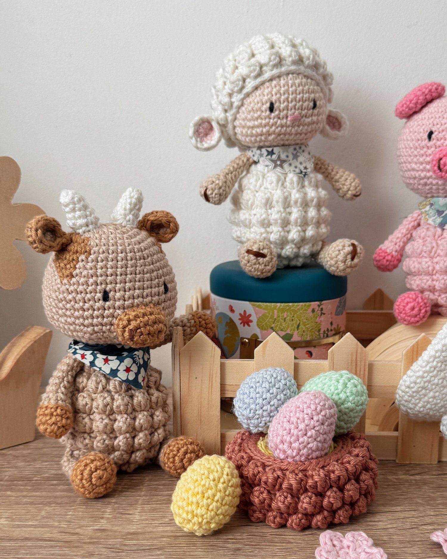 Ce petit nid de Pâques, crocheté dans l’esprit des petits personnages de la Ferme des Petits Riens, est imaginé pour accompagner ses habitants, ou non. Il peut apporter une touche de douceur à votre décoration de printemps.