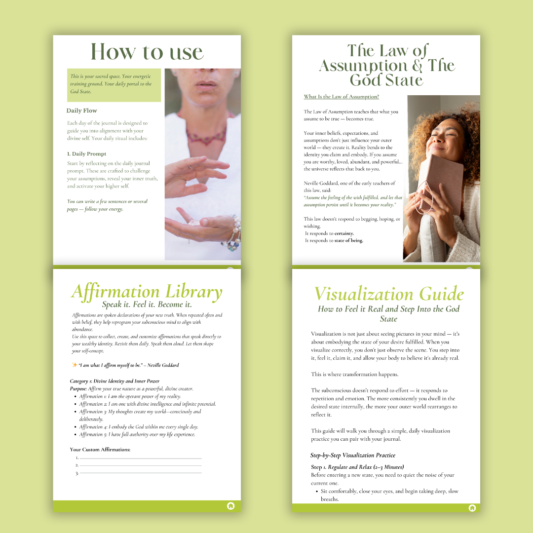 Reclaim your divine identity and rewrite your reality from within. The I Am: God State Journal is a sacred 90-day guided journey designed to help you step fully into your power using the Law of Assumption, identity shifting, and soul-deep self-connection.