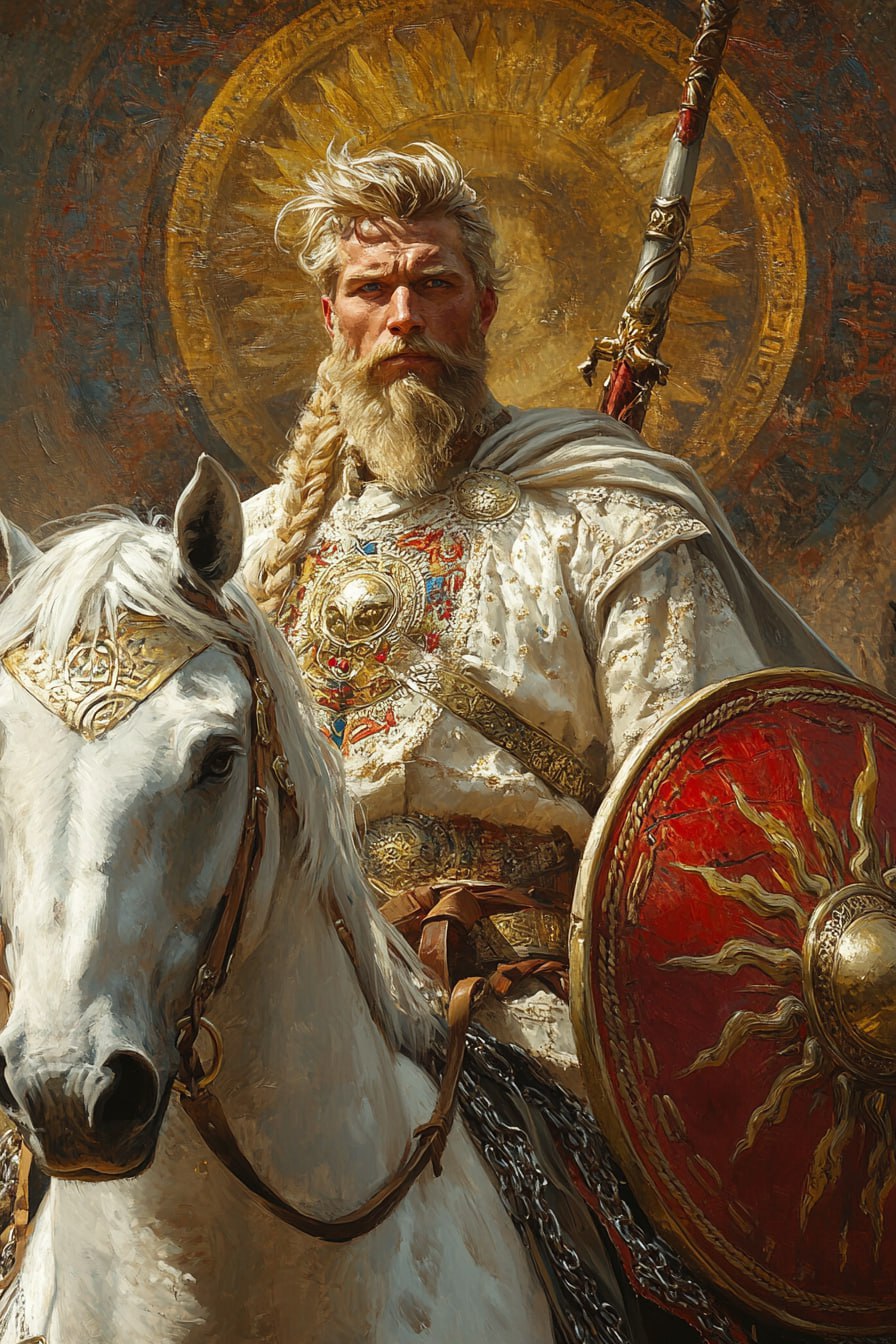 Step into legendary Slavic mythology with a majestic Bogatyr riding a radiant white horse adorned with golden harness details. Dressed in an elegant kaftan with red and gold embroidery layered over shimmering chainmail, this powerful warrior embodies strength, honor, and timeless beauty. The golden spear, symbolic red shield, and intricate sun mandala background create a spectacular fusion of culture, symbolism, and visual impact. Perfect for creators seeking detailed, professional, and unique artwork that captures heroic energy and rich historical inspiration.