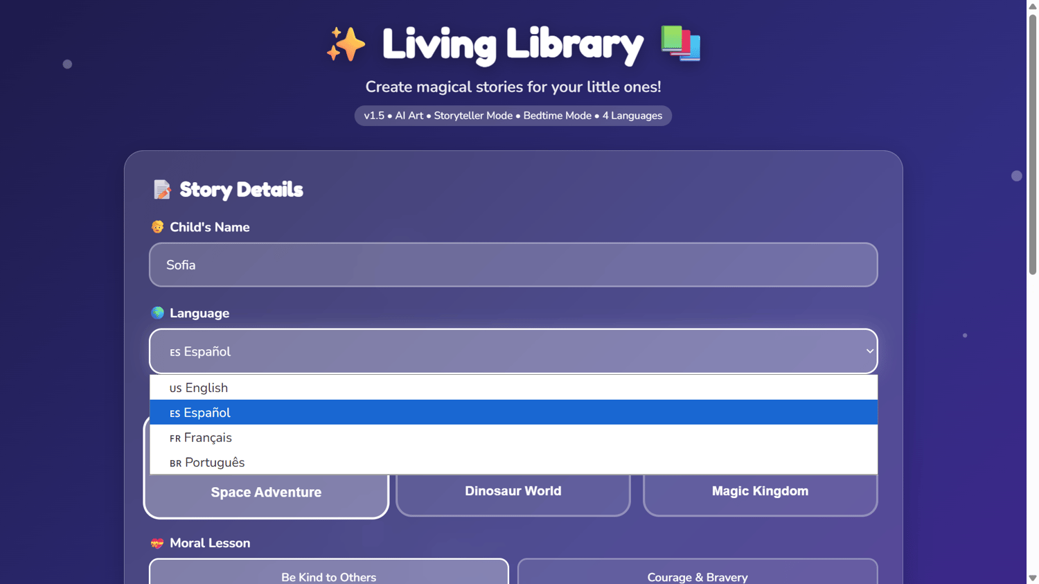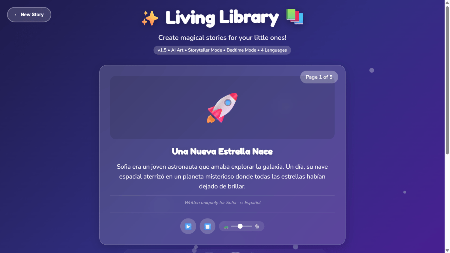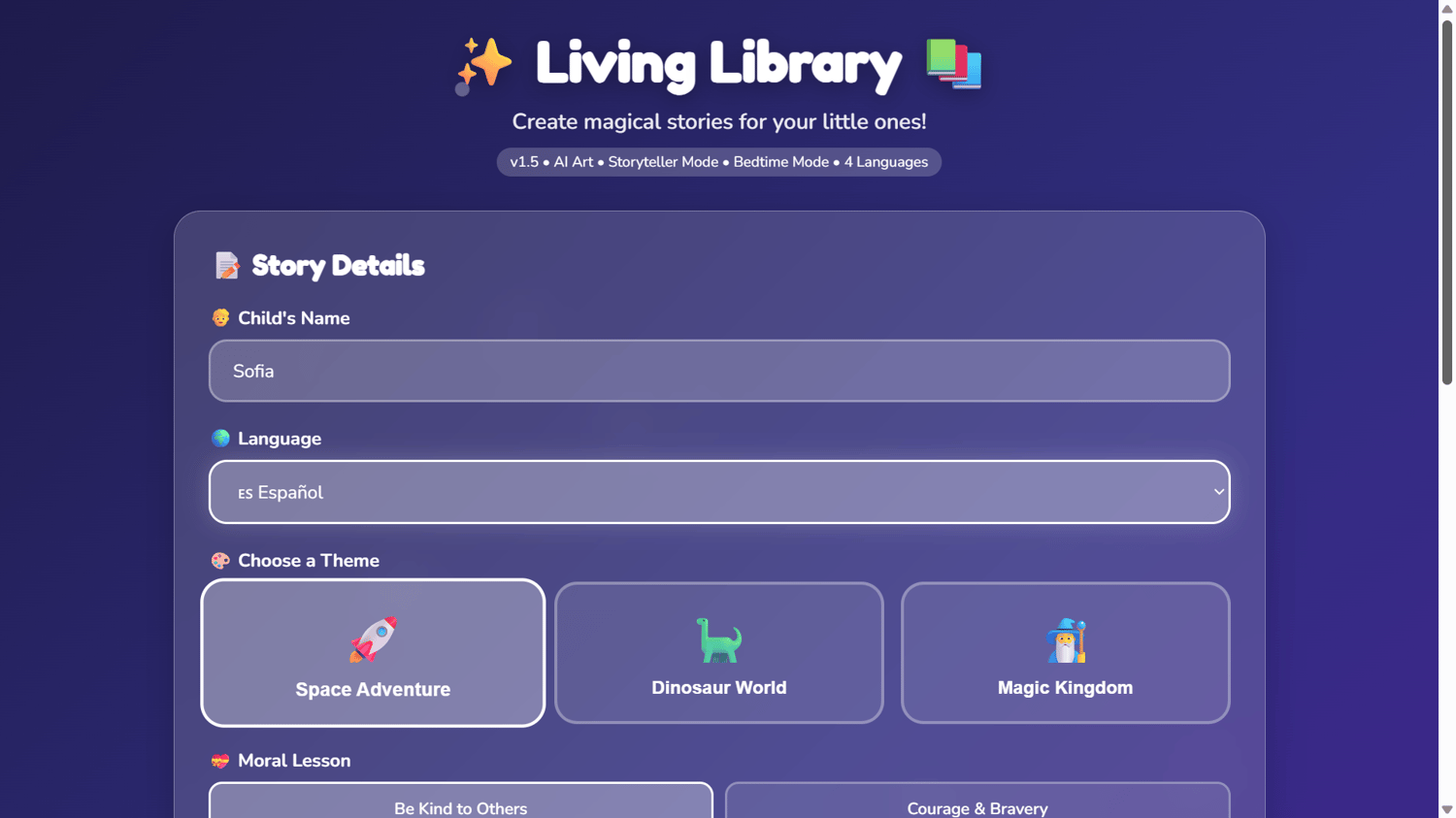 Living Library generates personalized stories instantly. Your child's name. Their favorite themes. In their language.