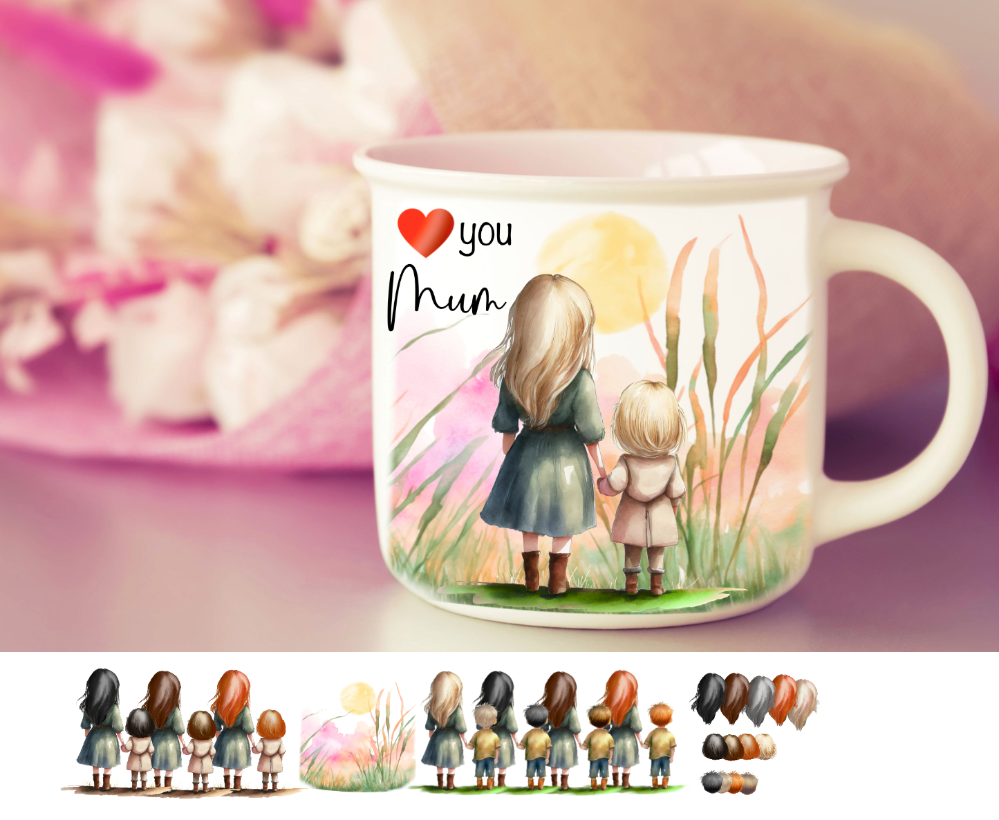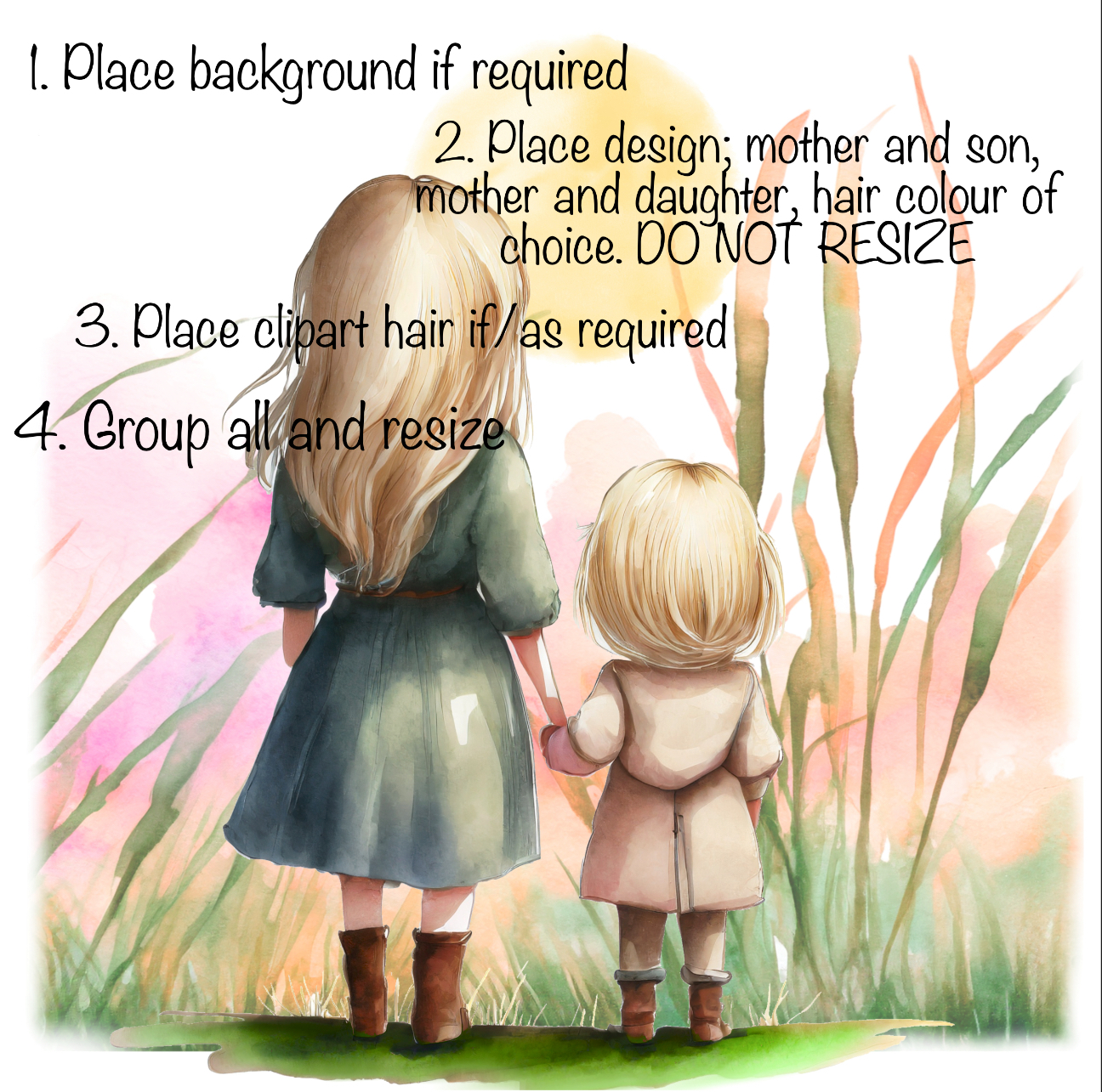 Mother’s Day, grandma, nanny etc. son, daughter, 8 pre-made designs. Includes background, hair clipart. 22 PNG files.