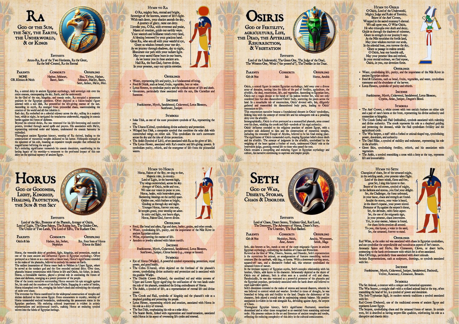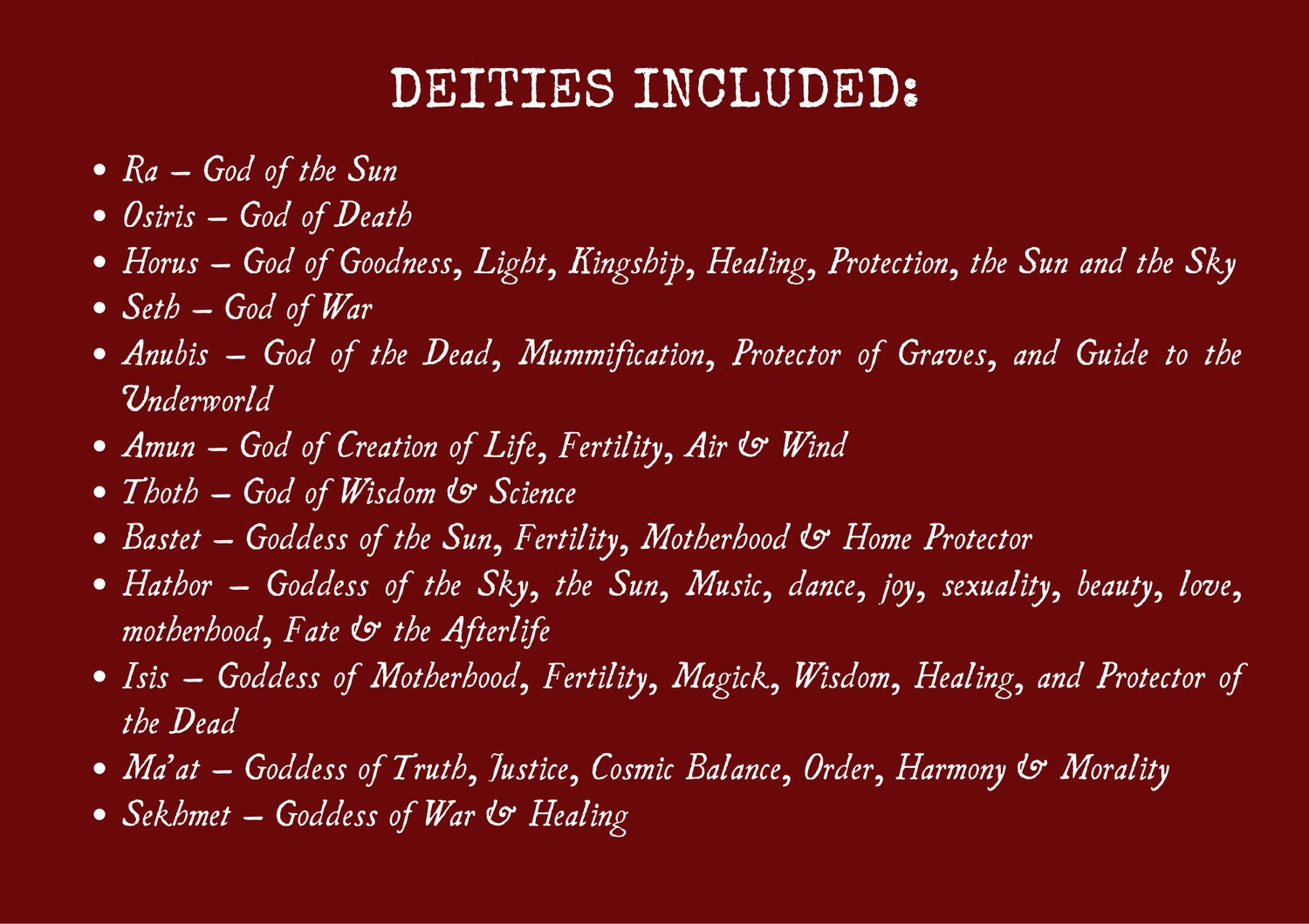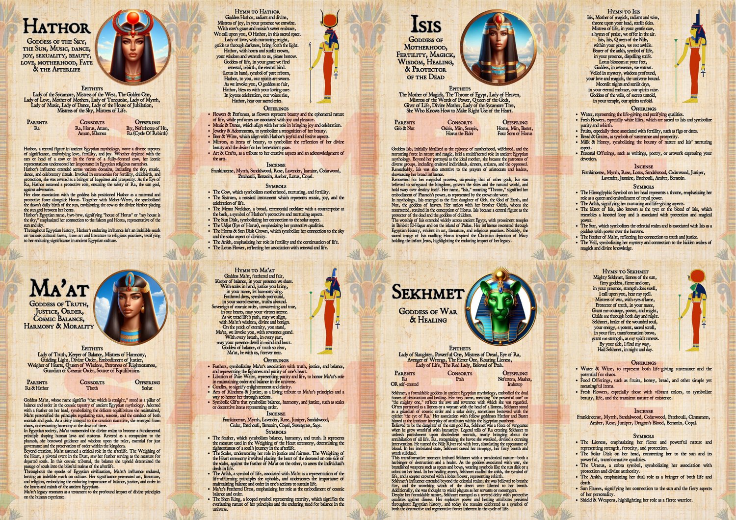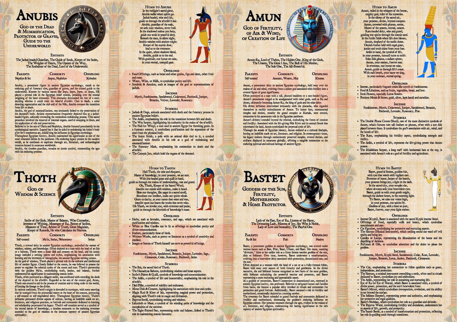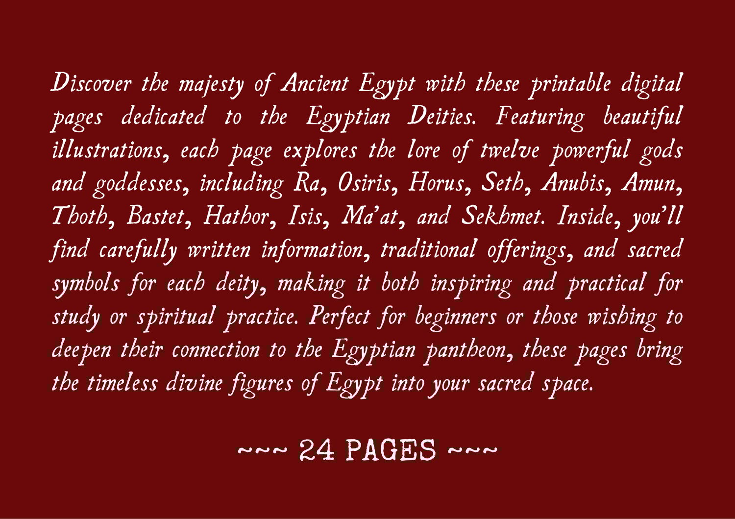 Discover the majesty of Ancient Egypt with these printable digital pages dedicated to the Egyptian Deities. Featuring beautiful illustrations, each page explores the lore of twelve powerful gods and goddesses, including Ra, Osiris, Horus, Seth, Anubis, Amun, Thoth, Bastet, Hathor, Isis, Ma’at, and Sekhmet. Inside, you’ll find carefully written information, traditional offerings, and sacred symbols for each deity, making it both inspiring and practical for study or spiritual practice. Perfect for beginners or those wishing to deepen their connection to the Egyptian pantheon, these pages bring the timeless divine figures of Egypt into your sacred space.