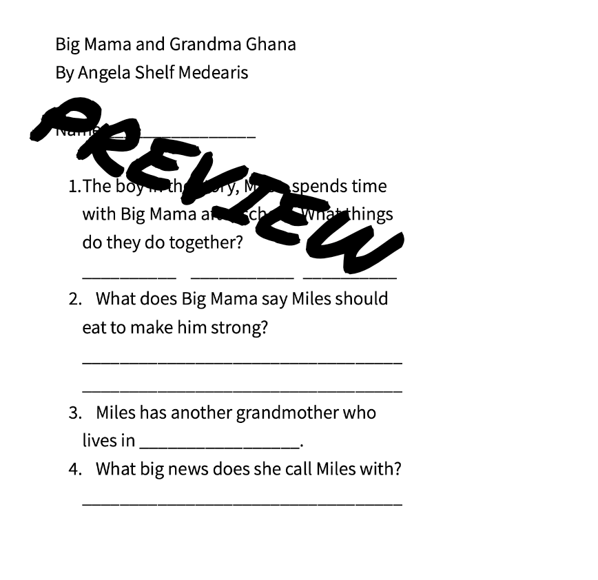 The comprehension worksheet for "Big Mama and Grandma Ghana" by Angela Shelf Medearis includes a series of questions designed to assess a reader's understanding of the story. The questions cover a range of topics, including plot details, character motivations, and thematic elements. The goal of the worksheet is to help readers engage with the text on a deeper level and develop their reading comprehension skills.