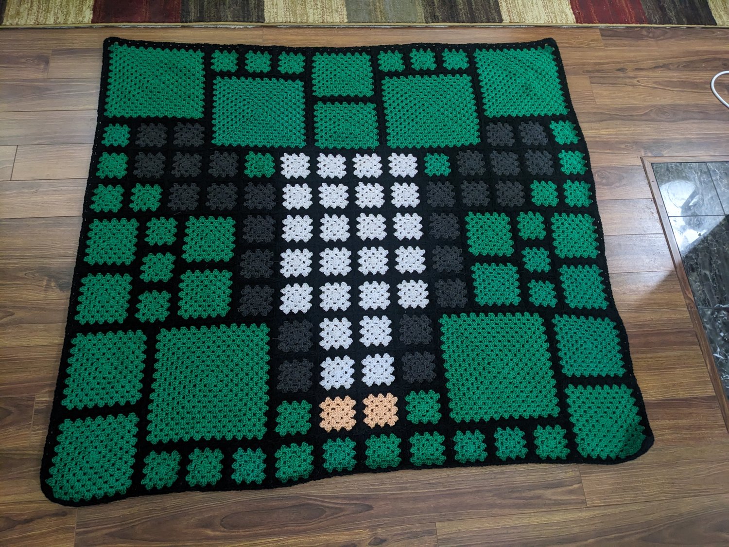 Finished size is approximately 11.2 x 10.4 times bigger than your 5-round square. Sample measures 64” x 59”