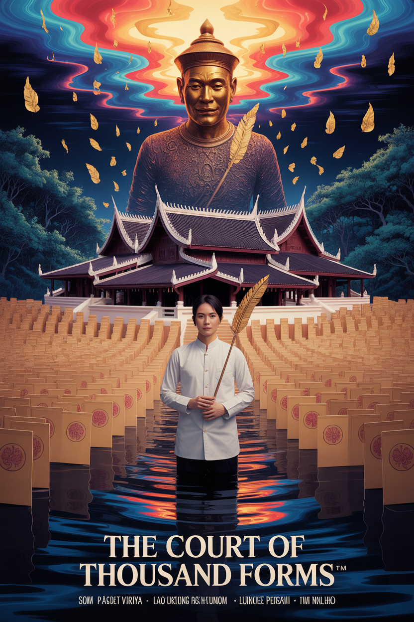 The Court of Thousand Forms™ fuses Kafka, Shakespeare, and Lao mysticism into a 7×45 prestige series where words literally reshape reality. Som, an archivist haunted by his brother’s disappearance into an “unfiled form,” joins the Amalgam Office to rewrite the laws of being. Lao ritual becomes the physics of power—baci threads as sentence sutures, khene drones as gavel frequencies, mor lam rhythms as syntax stabilizers. The first in a trilogy (Forms → Ledger → Ordinance), it expands from personal guilt to systemic myth.