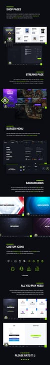 We know merchandise is important in an eSports organization, that’s why we included complete shop pages, with 2 shop versions, shopping cart, item page with reviews and account settings and orders.