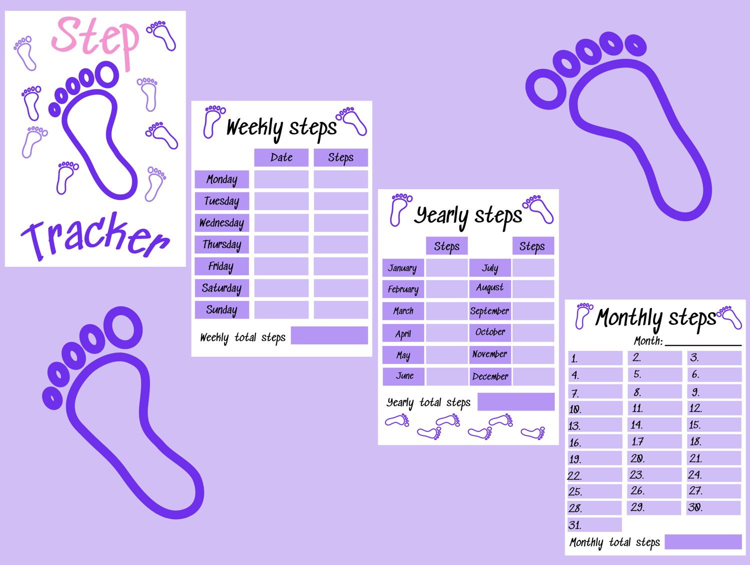 Daily, Weekly, Monthly and Yearly Step Tracker | Downloadable and Printable Walking Journal | Digital Download Weekly Fitness Planner | Purple