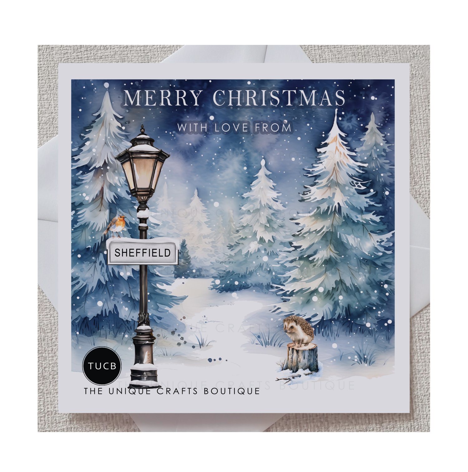 A pack of Ten greetings cards printed with a beautiful snowy Winter woodland. A sweet little Robin is perched on the signpost which displays 'Sheffield' and a lost little hedgehog is sat on an old tree stump taking in the scene. The greeting 'Merry Christmas with love from' is displayed above in the night sky.