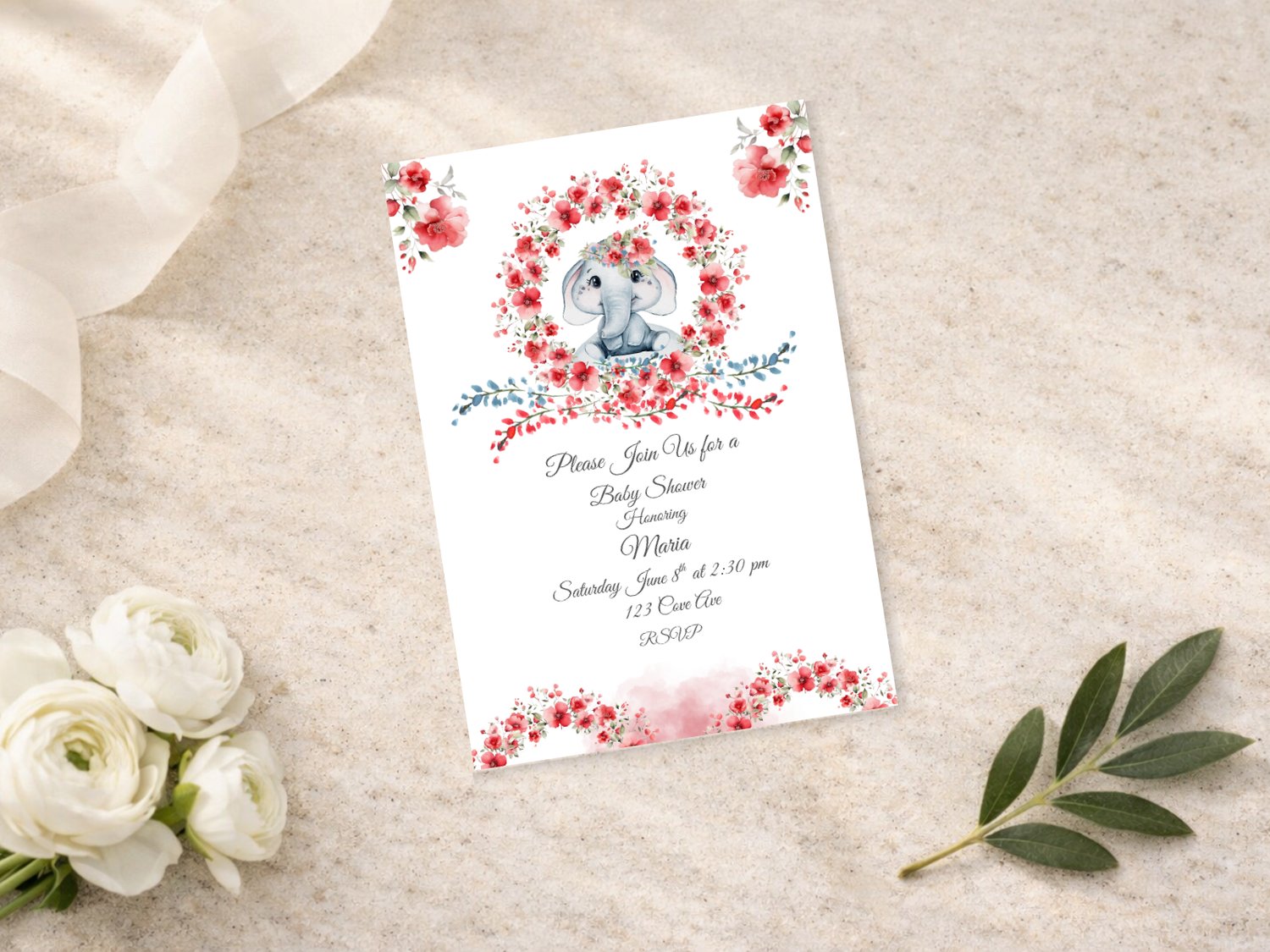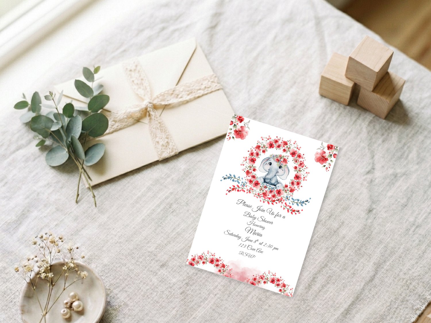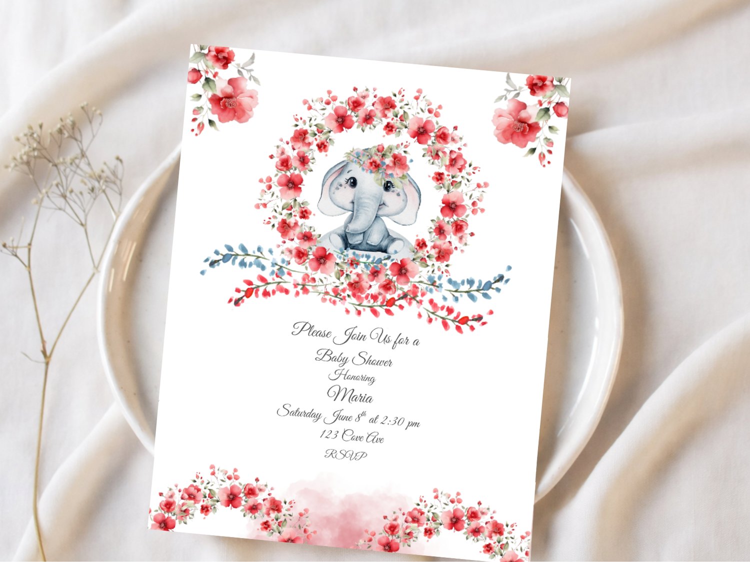 Celebrate your little girl with this adorable elephant-themed baby shower invitation! Featuring bright cheerful colors and a sweet baby elephant design, this editable invite is the perfect way to welcome your bundle of joy. You can easily personalize it with your own wording before printing or sending digitally.