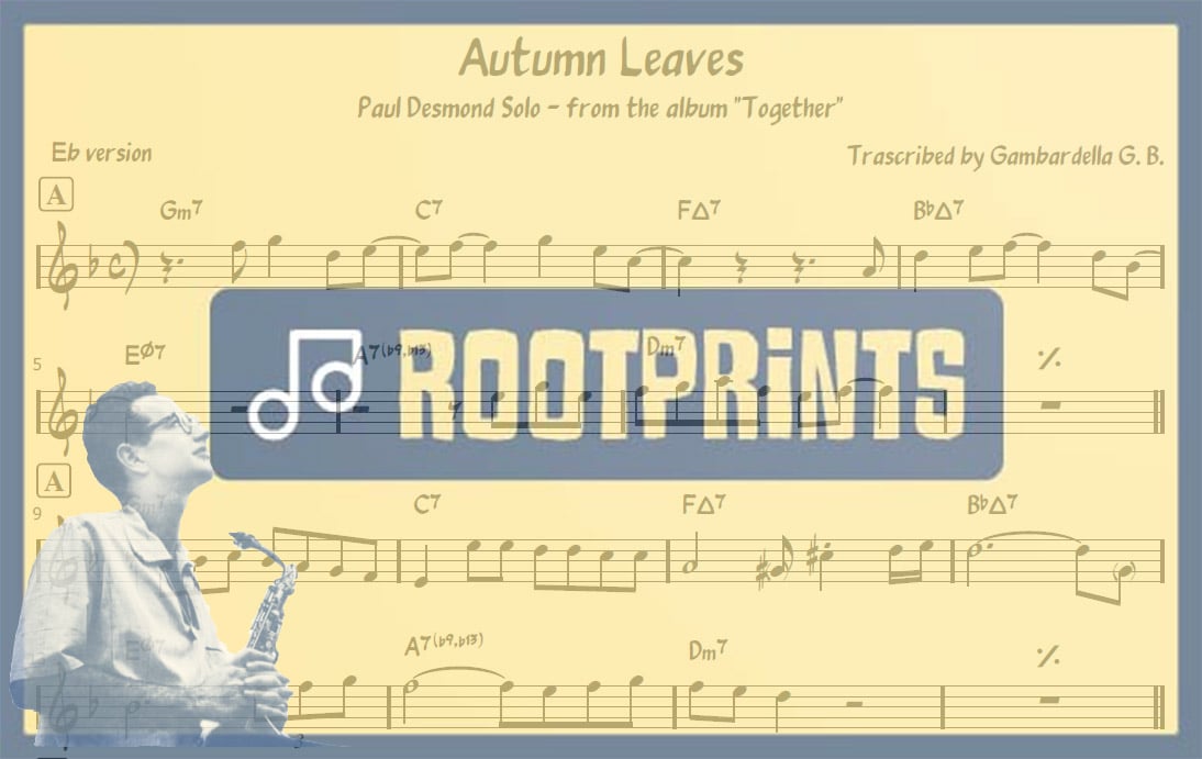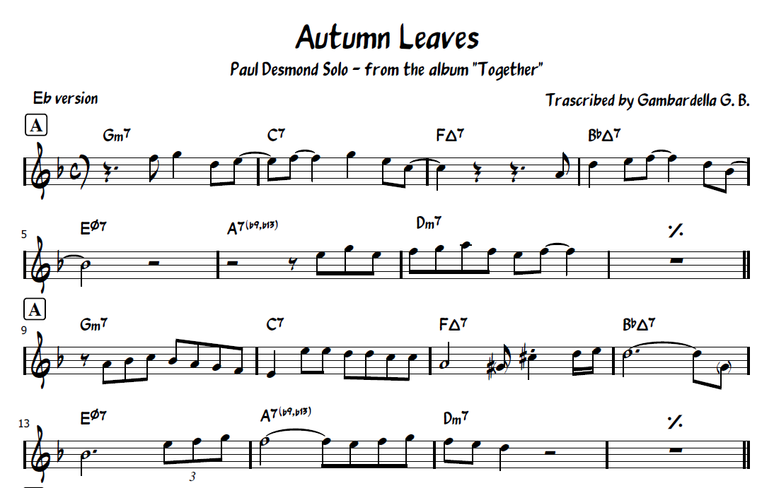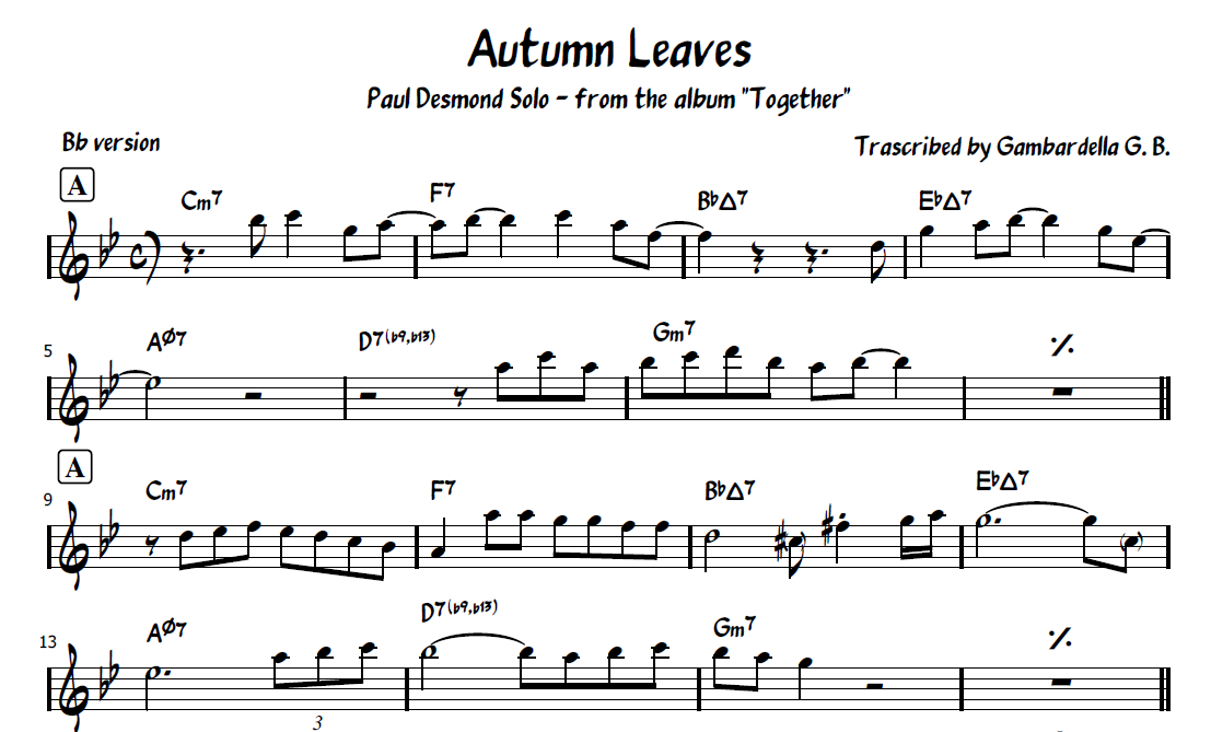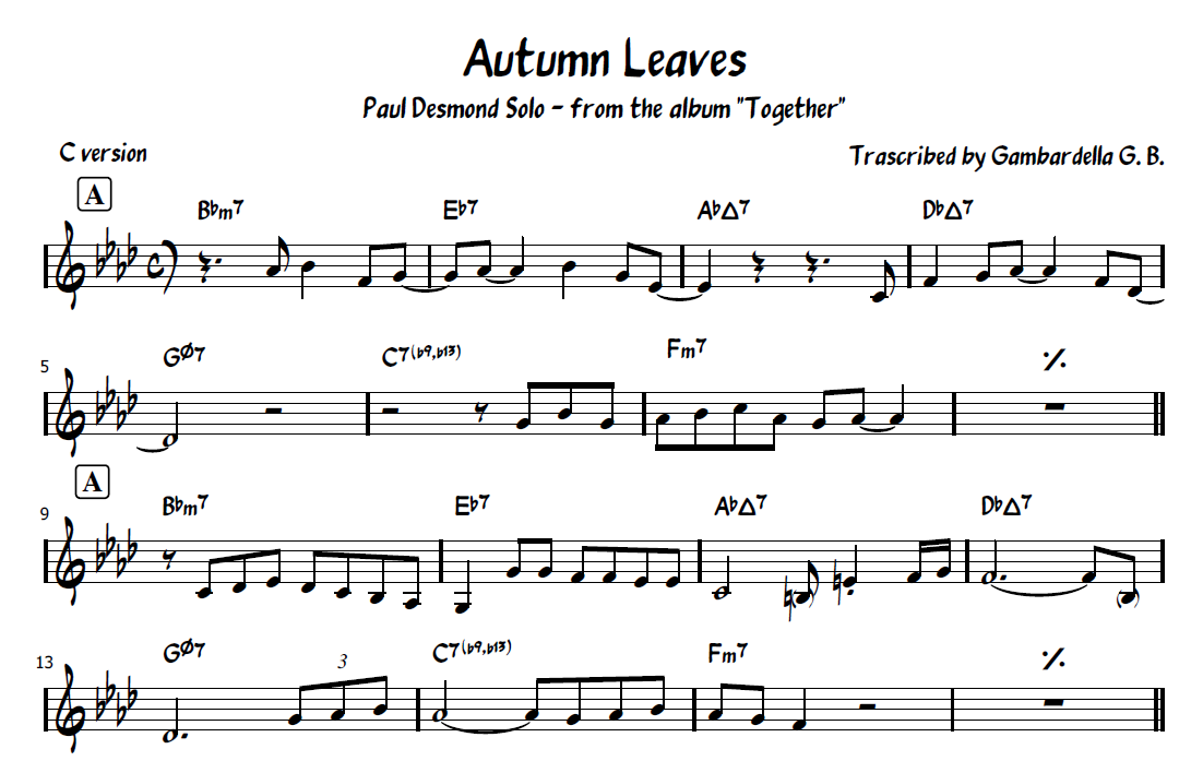 Paul Desmond solo on Autumn Leaves for alto/baritone sax and Eb instruments, tenor/soprano sax and Bb instruments and for piano or all the C instruments.