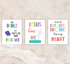 This set of 3 digital printable posters includes lyrics from popular children's bible songs such as I've Got The Joy Down In My Heart, The Bible Song, and Jesus Loves Me This I Know. Makes beautiful decor for a church or sunday school classroom as well as a christian home, and would be a thoughtful gift for a pastor, teacher, or parent.