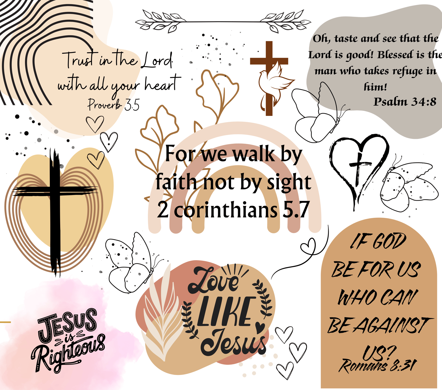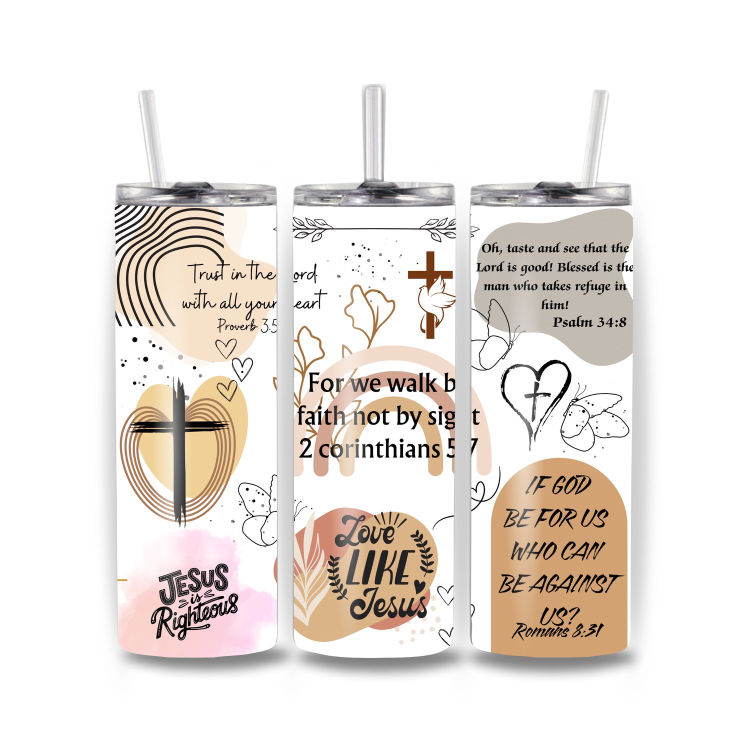 Stay inspired all day with this Neutral Christian 20 oz Skinny Tumbler, beautifully designed with soft beige, tan, and blush tones. Featuring powerful scriptures such as Proverbs 3:5, 2 Corinthians 5:7, Romans 8:31, and Psalm 34:8, this tumbler is perfect for faith-filled motivation wherever you go.