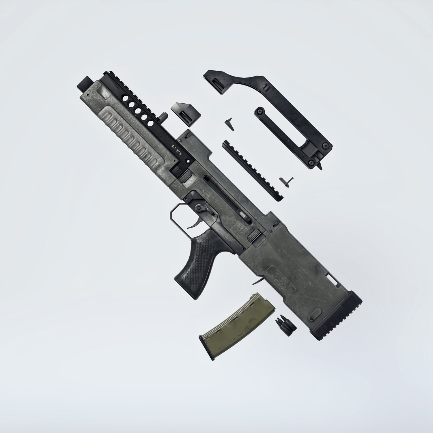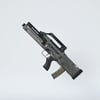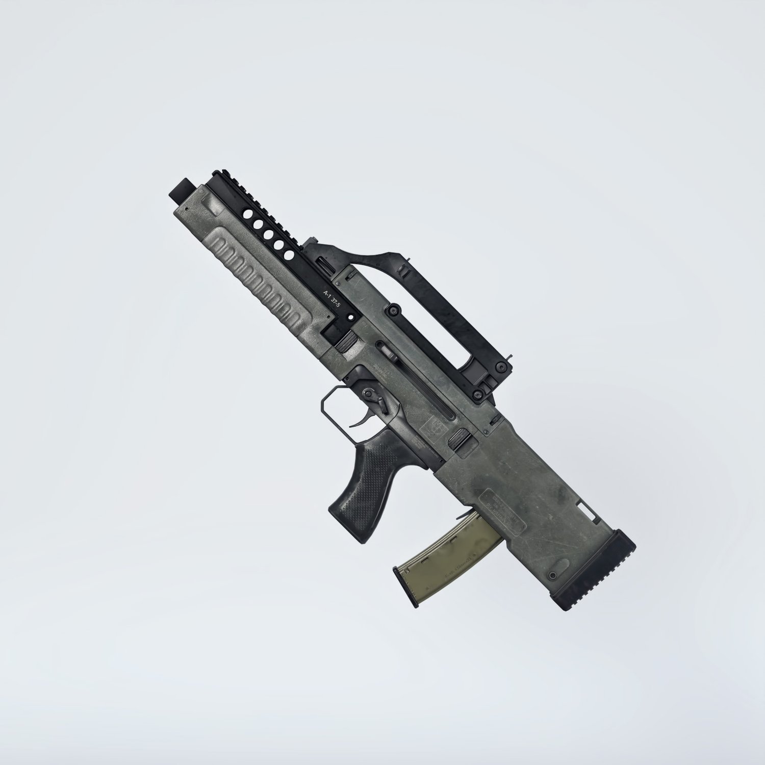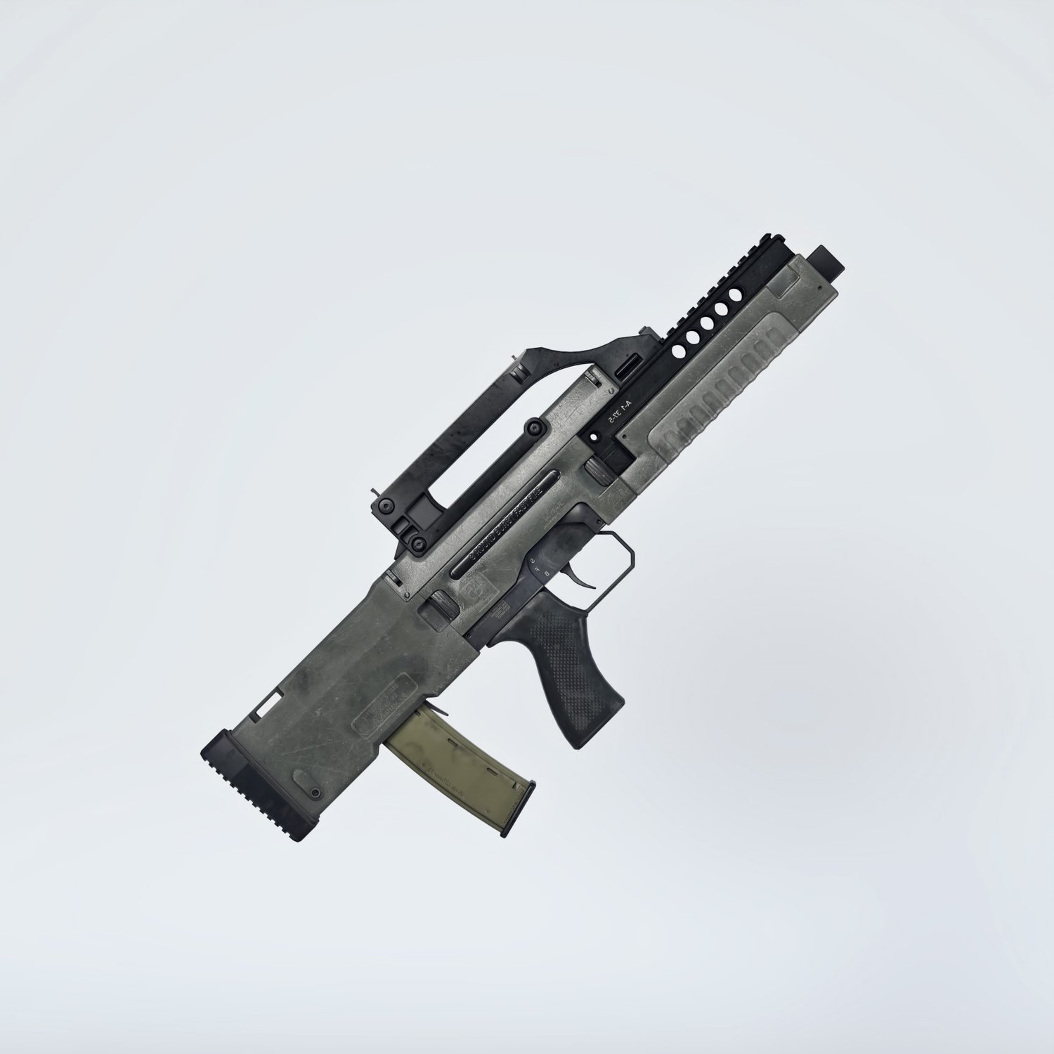 The gun is probably based on G11 (which you can fin in the store too). Cool bullpup from the parallel universe. The prop is rigged and converted for use with DAZ. Trigger, charging handle, mag etc also rigged for more realistic pictures. Includes an iron sights and a rail combo or a heightened handle. All can be hidden if needed.