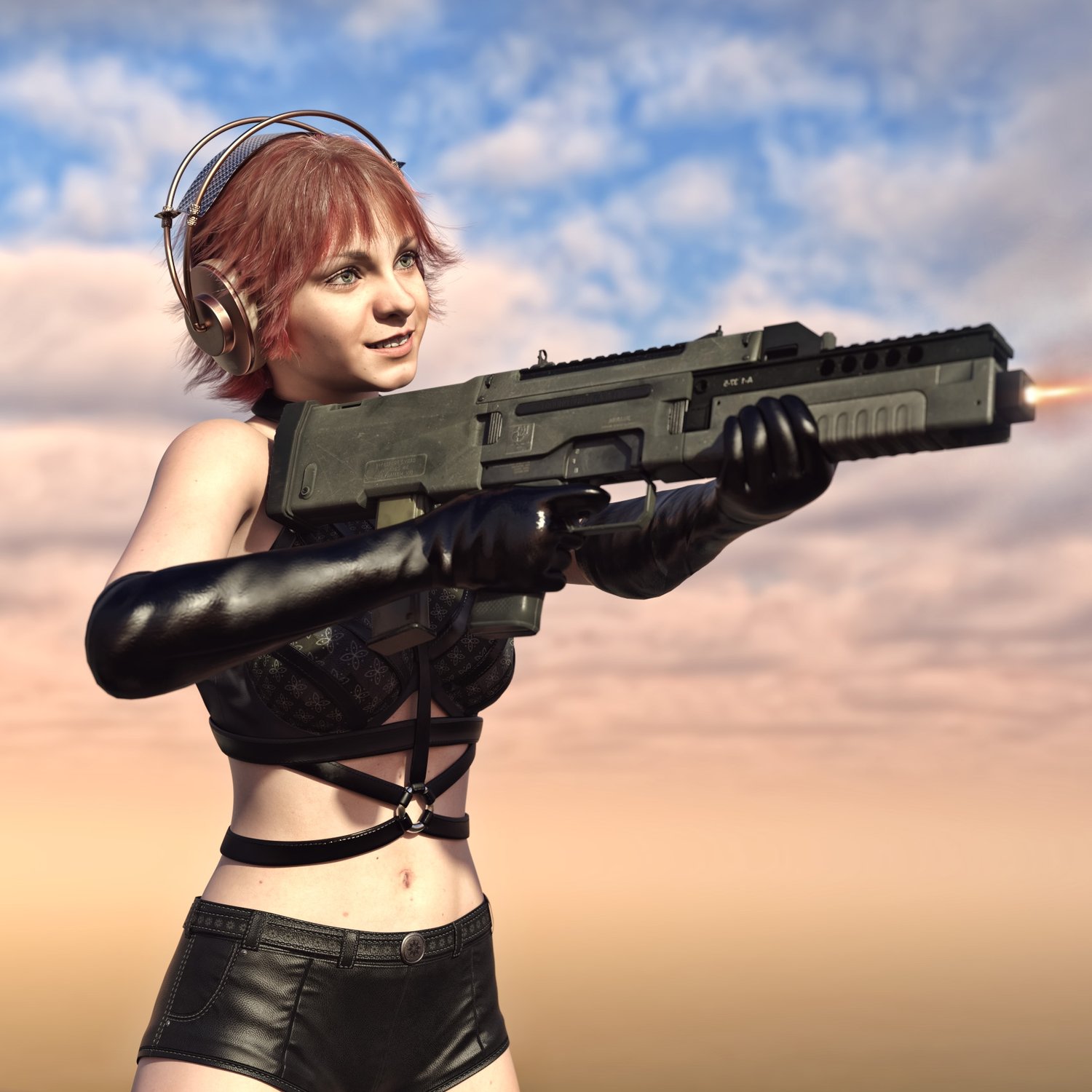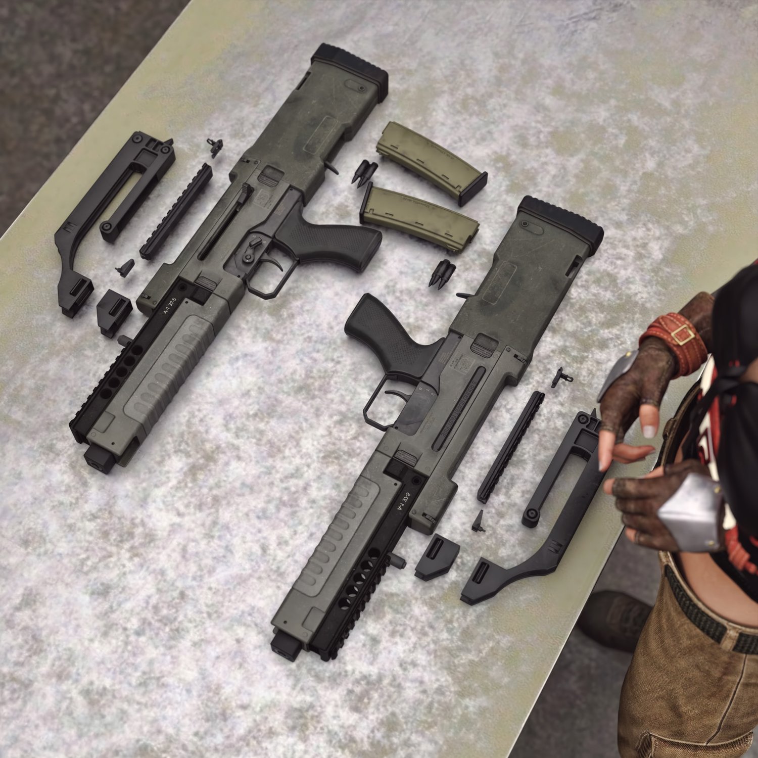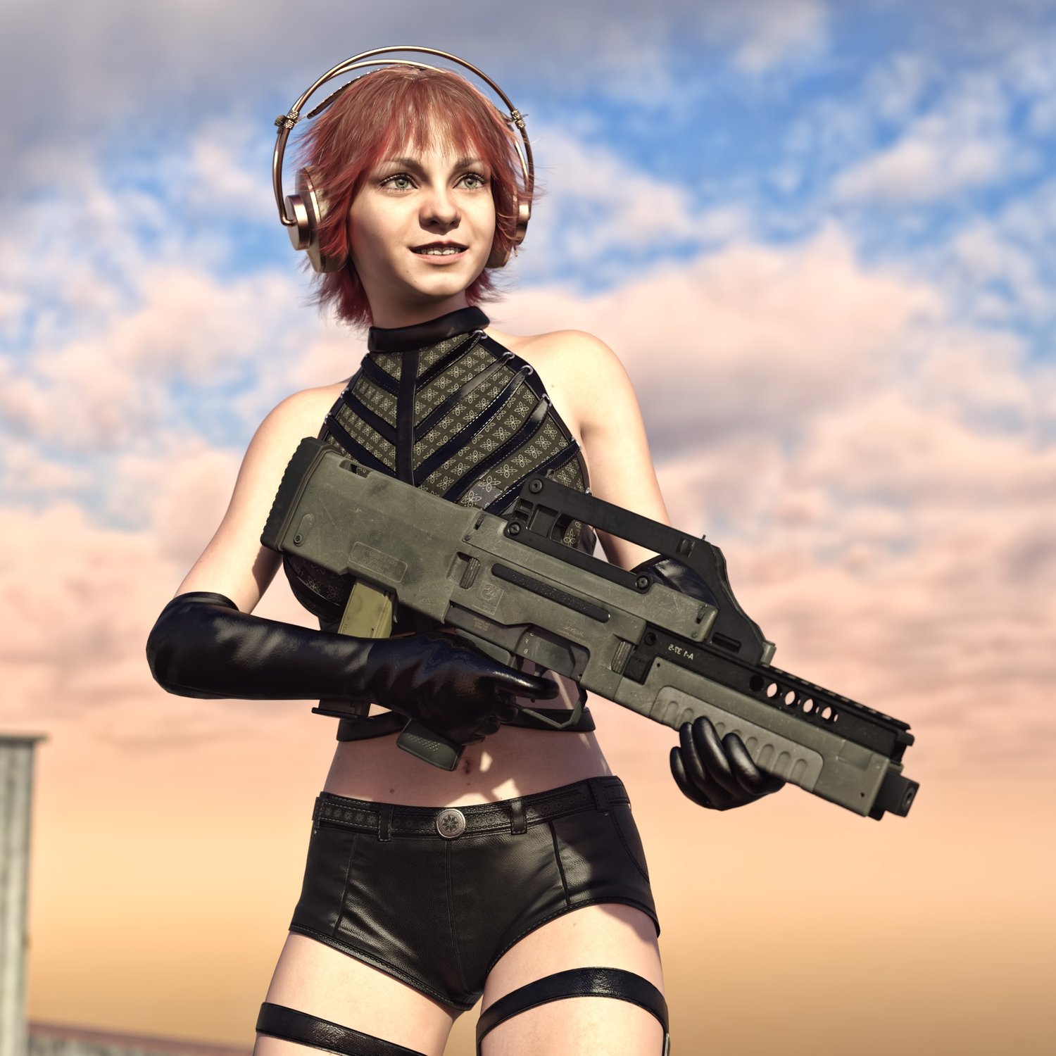 The gun is probably based on G11 (which you can fin in the store too). Cool bullpup from the parallel universe. The prop is rigged and converted for use with DAZ. Trigger, charging handle, mag etc also rigged for more realistic pictures. Includes an iron sights and a rail combo or a heightened handle. All can be hidden if needed.