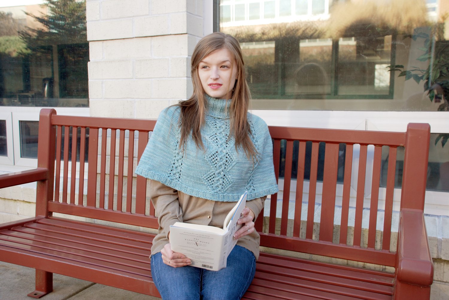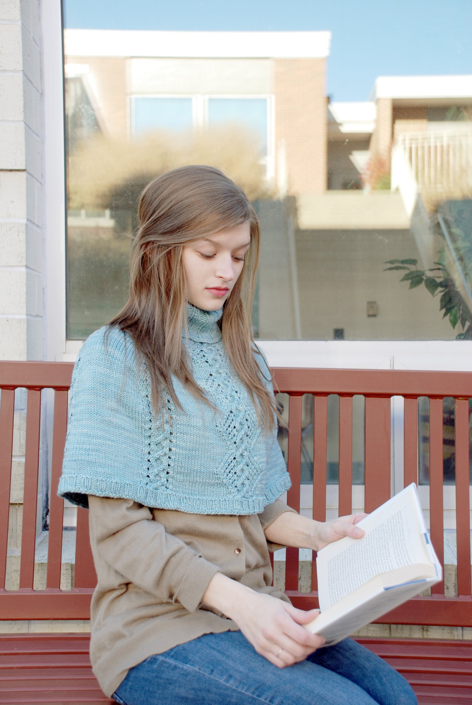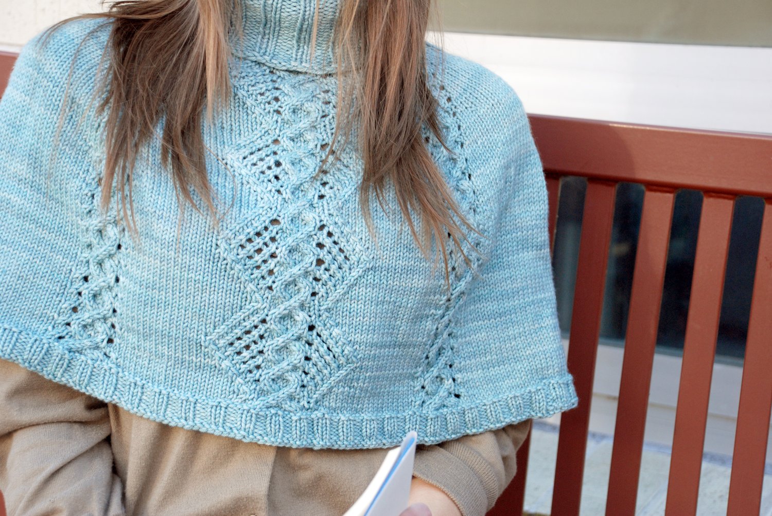 This worsted-weight capelet blends all of my favorite elements of knitting: cabling and lace, ribbing and stockinette, all worked in the round in one piece. A quatrain is a type of poem with four lines of alternating rhyme scheme. There are lots of fours in this capelet - four lace patterns down the front, four cable raglan lines that form the base of the shaping, and more. The resulting top is cozy around the neck, shoulders, and upper arms, but not too constricting or heavy. Just right for crisp evenings reading poetry in the park!