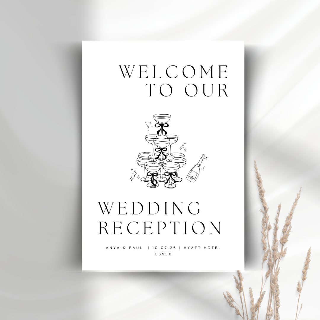 Cheers to love! Welcome your guests in style with this elegant Welcome Wedding Sign featuring a chic champagne tower illustration. Perfect for setting the tone at your ceremony, cocktail hour, or reception, this design adds a touch of celebration and sophistication to your big day.