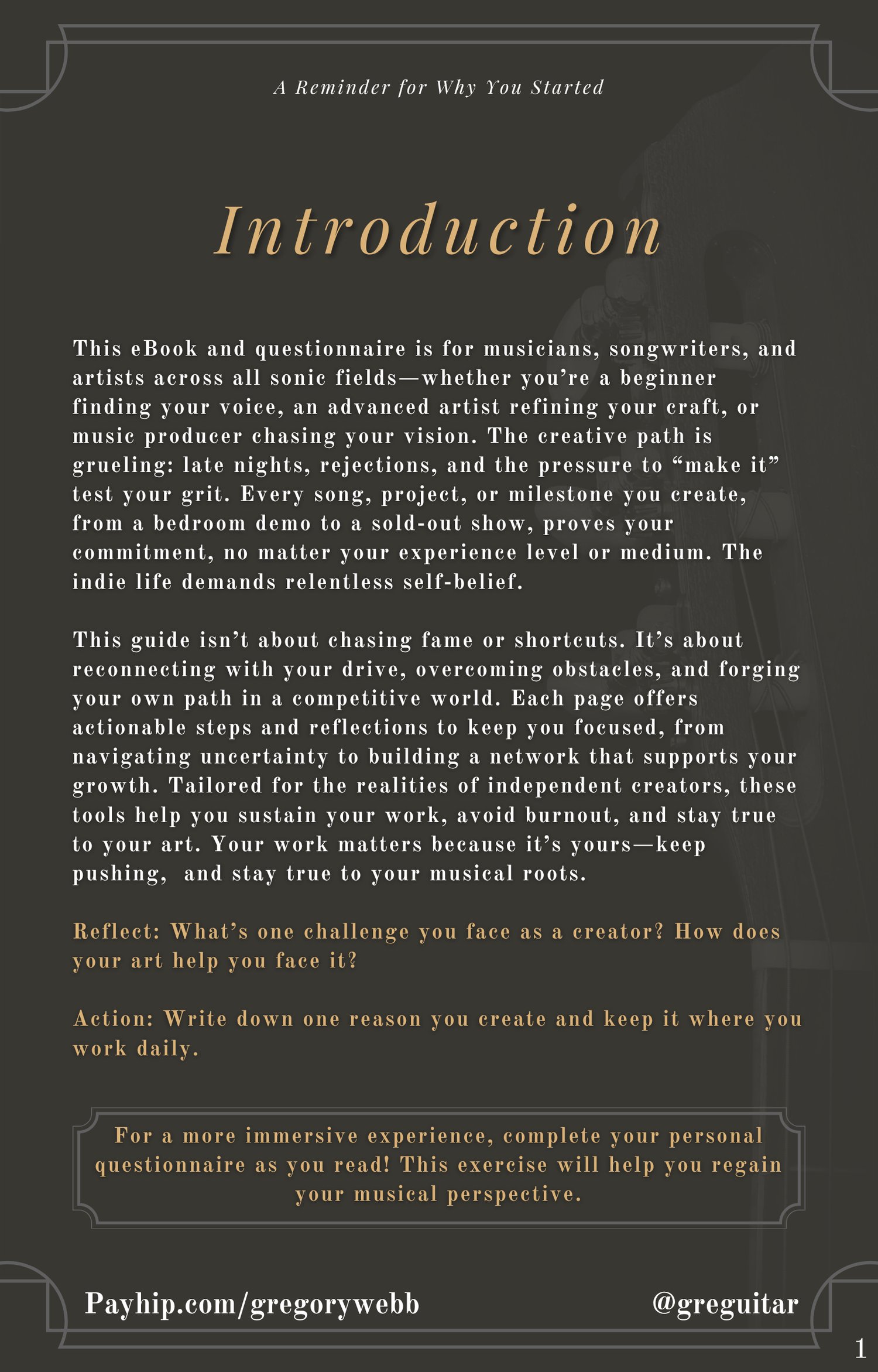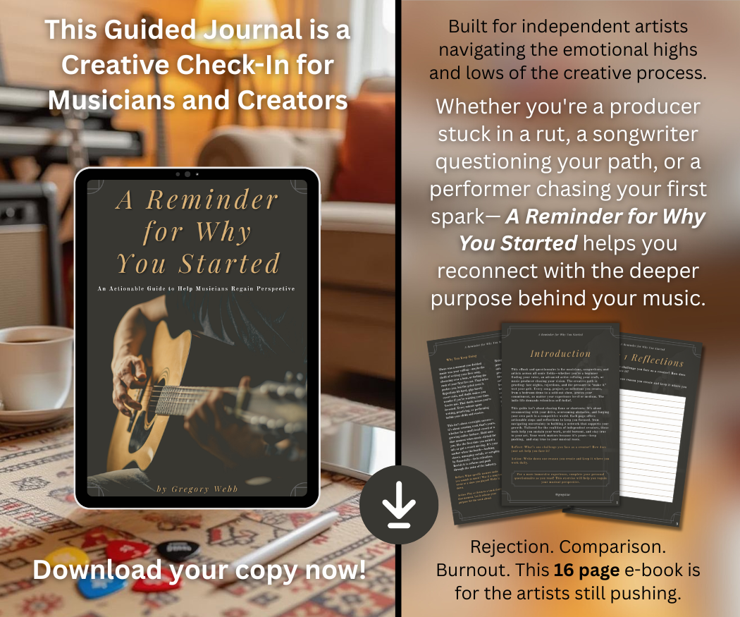 đź’ This guided journal is a creative check-in for musicians and creators navigating the emotional highs and lows of the creative process. Whether you're a producer stuck in a rut, a songwriter questioning your path, or a performer chasing your first spark—A Reminder for Why You Started helps you reconnect with the deeper purpose behind your music. Rejection. Comparison. Burnout. This 16-page e-book is for the artists still pushing.