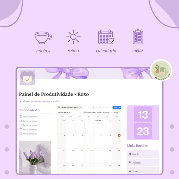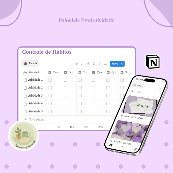 Aqui você encontra um espaço no Notion para acompanhar tarefas, metas e hábitos do dia a dia de forma simples e organizada!