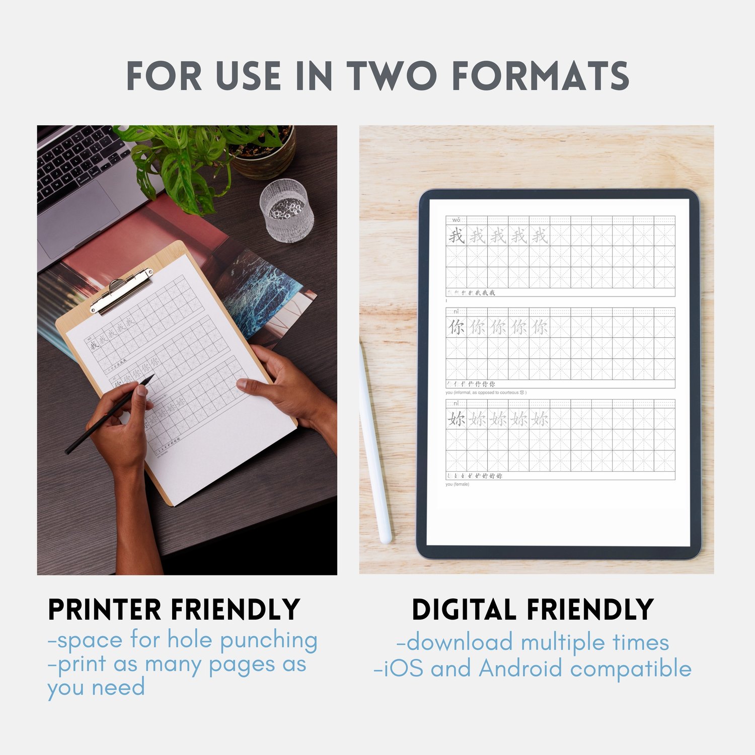 - 3 x Practice sheet files in different formats to suit different levels and needs; mi zi ge (beginner), tian zi ge (intermediate) and blank (advanced) (PDF)