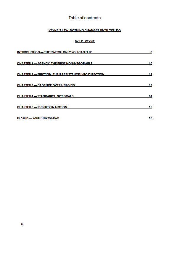 In five precise chapters, J.D. Veyne shows how to reclaim agency, use friction as a compass, trade heroics for cadence, replace vague goals with clear standards, and lock identity to consistent action. Each chapter includes a practical drill you can execute the same day — no fluff, no jargon, just levers that move real life.